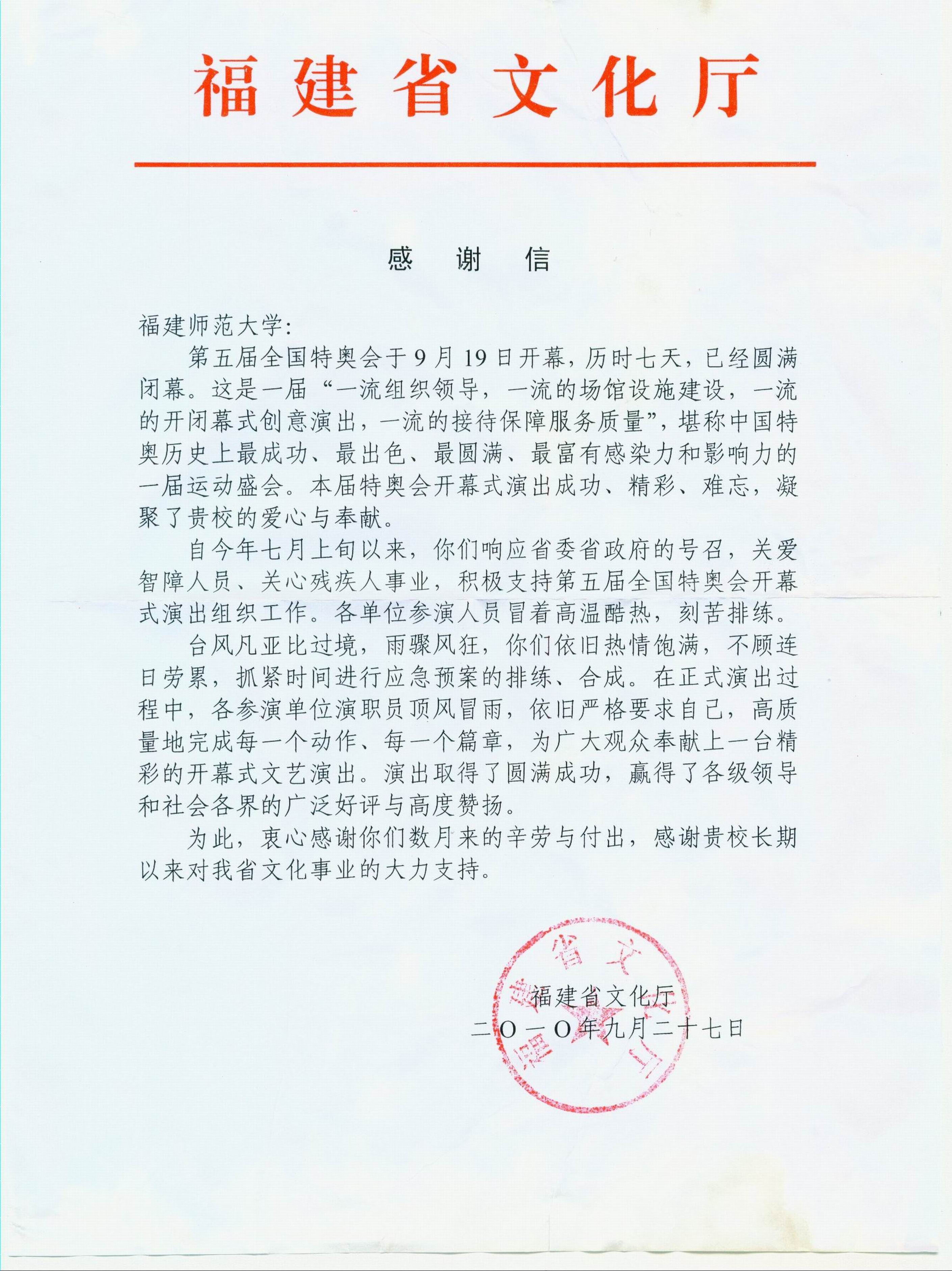 福建省文化厅致我校感谢信