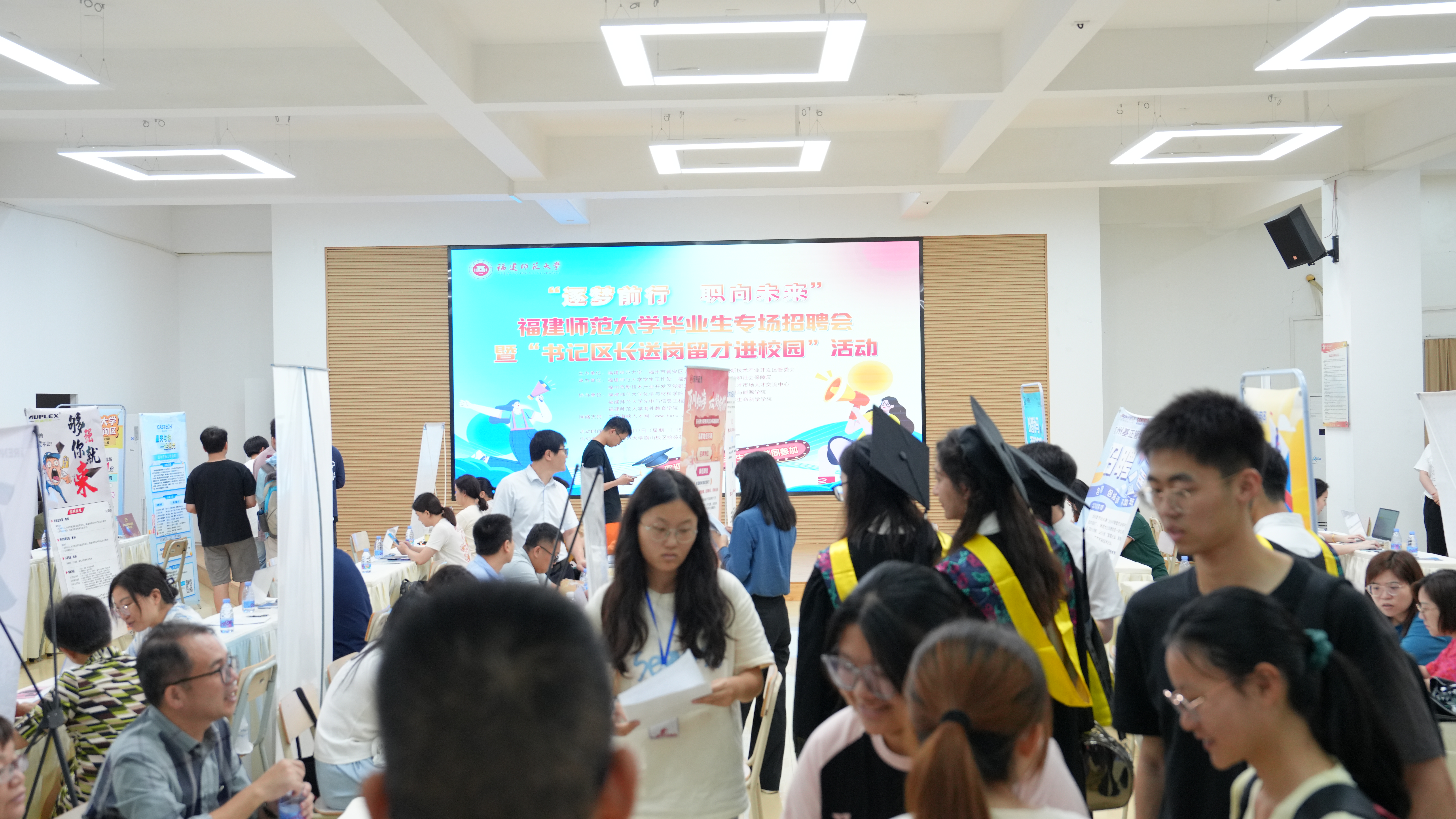 6月17日,“逐梦前行 职向未来”福建师范大学毕业生专场招聘会暨“书记区长送岗留才进校园”活动在旗山校区举行。招聘会由福州市晋安区人民政府、福州高新技术产业开发区管委会和我校联合举办。福州高新区管委会副主任、二级调研员林松旺,福州市晋安区政协副主席林秀锦,校党委副书记涂荣,学生工作部负责人、各学院分管学生工作负责人,毕业班辅导员以及2024届毕业生参会。