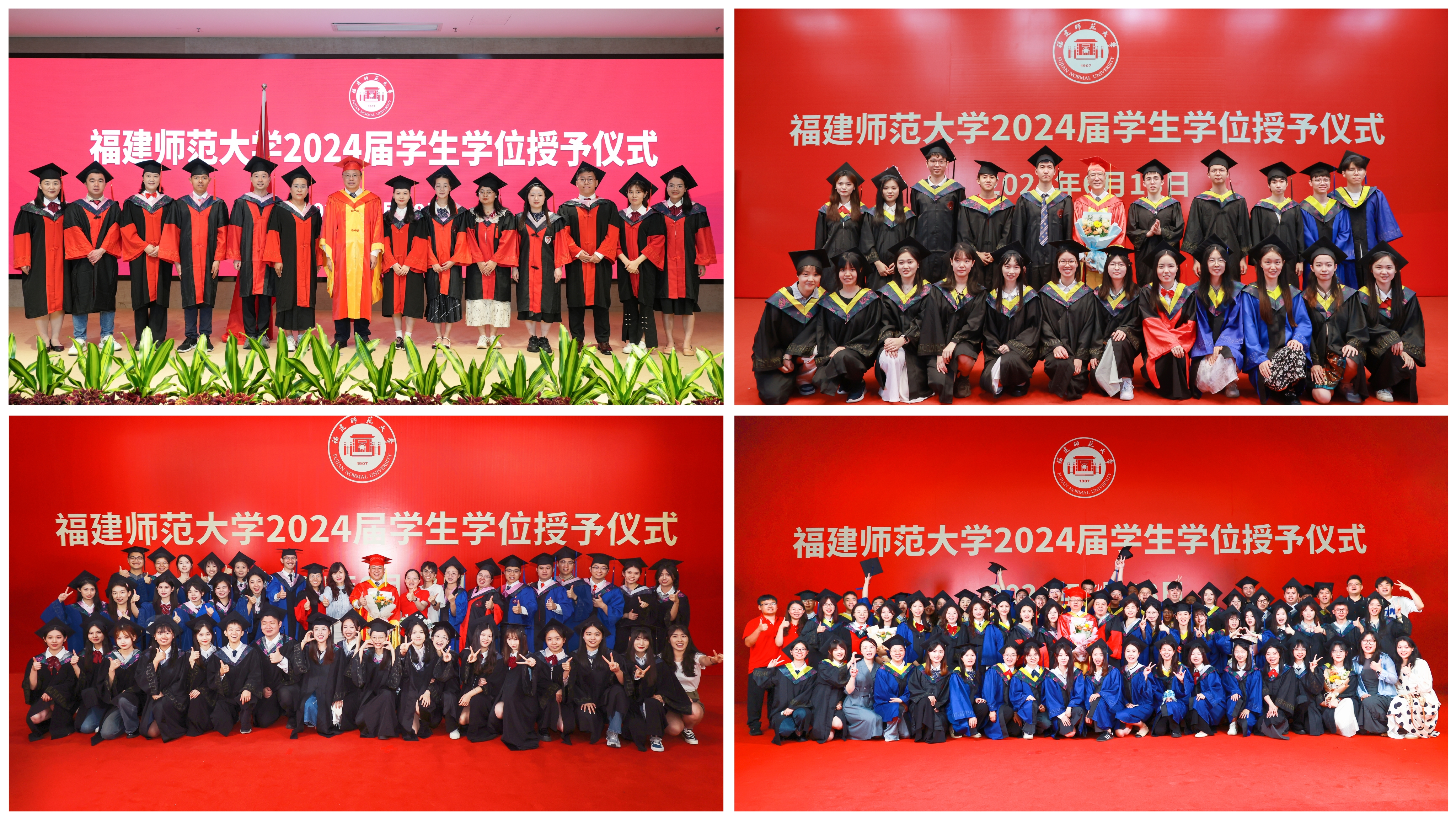 学位授予仪式分别在旗山校区宏达厅、青春剧场、图书馆学术大讲堂和大会堂举行。校领导潘玉腾、王长平、涂荣、陈庆华分别为毕业生执“拨穗礼”,并合影留念。