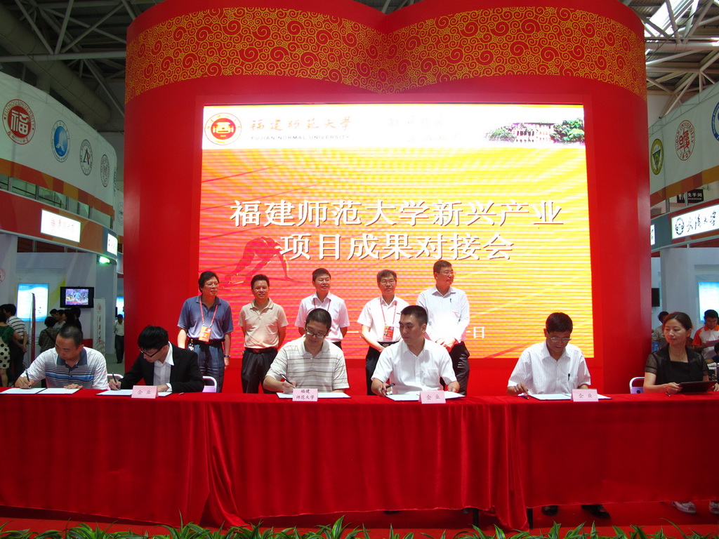 展会现场,我校推介参展项目288项,分布在教育部、科技部、农业部、林业部、全国总工会、海洋与渔业厅、中国青年科技创新馆、省轻工业联合会等展厅展示。6•18期间,我校“基于网格的环境空间数据挖掘”、“福建师范大学与沙县人民政府战略合作框架协议”、“二维码光学引擎开发与产业化”、“面向制造业的云计算智能图像识别技术服务平台”、“双极膜技术生产丁二酸新工艺”、 “智能用电管理控制系统设计开发”、“系统集成创新平台共建”、“年产150吨DHA海洋单细胞油脂的产业化”、“星形聚合物的电致发光材料及白光器件的开发与产业化”、“高耐热高性能塑料管道系统的开发与产业化”、“水库型饮用水源地水质控制管理系统开发”等41个项目分别与爱尔兰都柏林大学、沙县人民政府、新大陆电脑股份有限公司、福州欣创摩尔电子科技有限公司、福州一化化学品股份有限公司、福州闽冠伟业智能科技有限公司、福建星网视易信息系统有限公司、福建省福抗药业股份有限公司、福建嘉能光电科技有限公司、福建祥龙塑胶有限公司、福建省四创软件有限公司等单位现场签约,项目总投资额达三亿多元。
