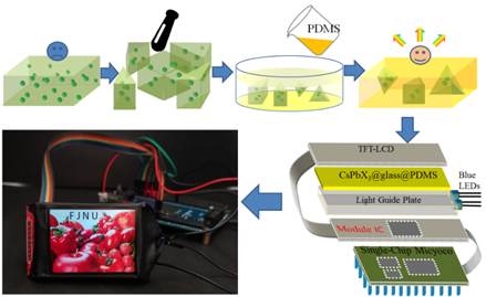 近日,我校物理与能源学院陈大钦教授课题组在高性能平板显示材料研究方面取得重要进展。课题组通过灵活应用玻璃原位晶化以及聚合物共混技术,制备出高量子效率(~100%)、高色纯度且稳定性优异的钙钛矿量子点发光复合材料,并将该材料引入TFT-LCD显示器的背光源中,构建出具有超宽色域和超高色彩还原度的新型平板显示原型机,其显示色域比市场上商用产品高出~30%左右,可达到103%NTSC。这一研究成果目前以《Perovskite Quantum Dots Glasses Based Backlit Displays》为题发表于《ACS Energy Letters》期刊上。该课题组硕士生林继栋为第一作者,黄烽研究员与陈大钦教授为通讯作者,本项研究得到科技部重点研究计划、国家自然科学基金面上项目、福建省自然科学重点基金和福建省科技计划引导性项目资助。
