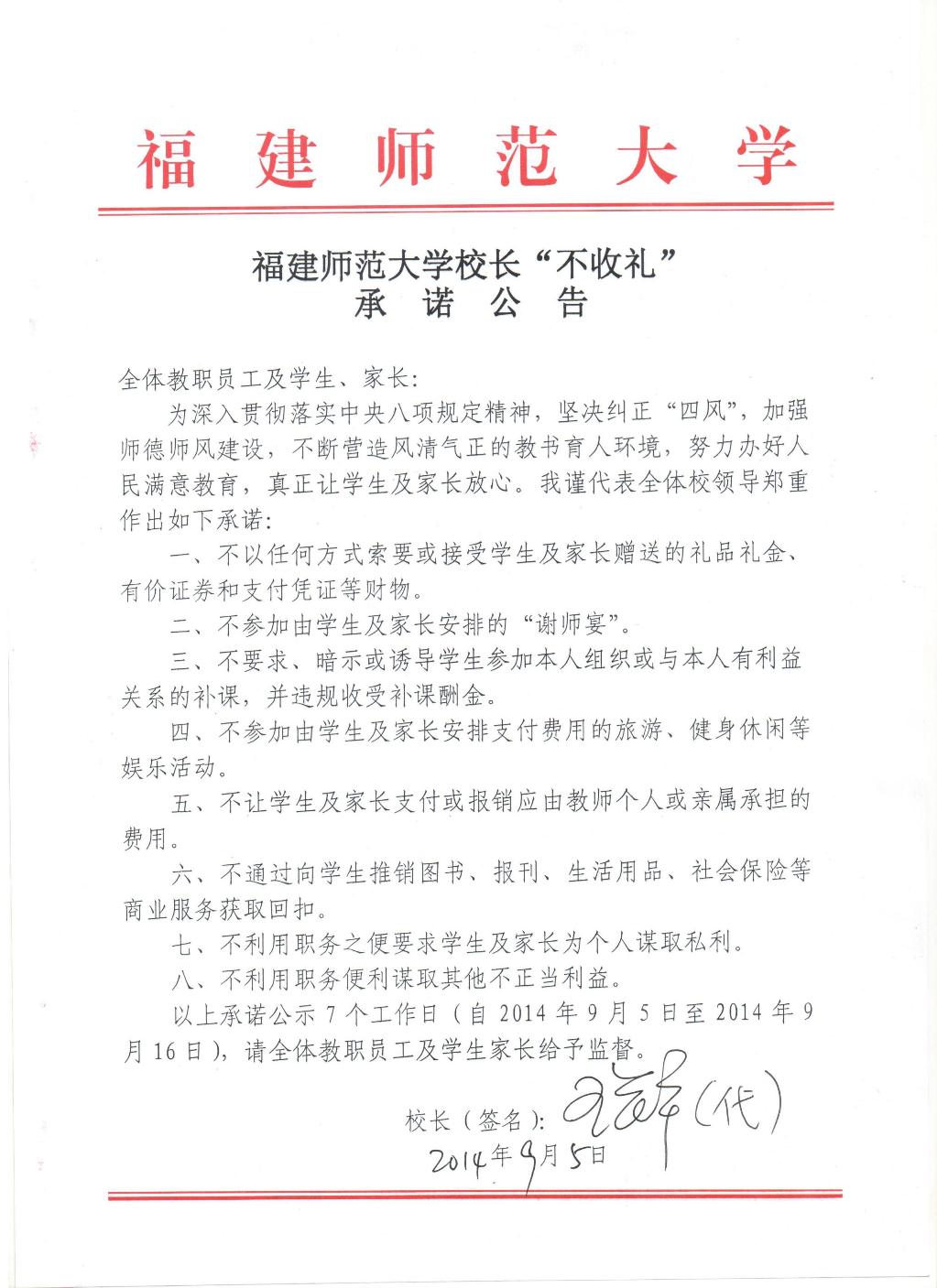 福建师范大学校长“不收礼”承诺公告