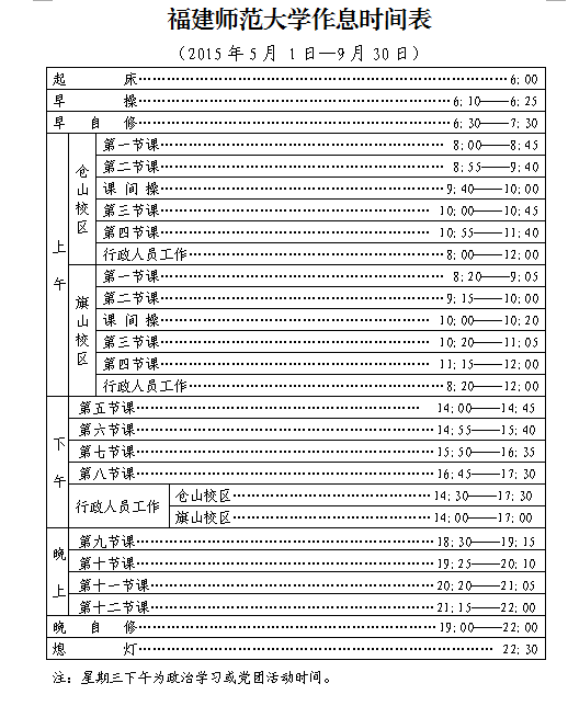 各单位: 现将《福建师范大学作息时间表(2015年5月1日—9月30日)》印发给你们,请将调整后的作息时间及时通知本单位师生,做好考勤管理工作,确保正常的教学科研秩序。 学校办公室 2015年4月14日