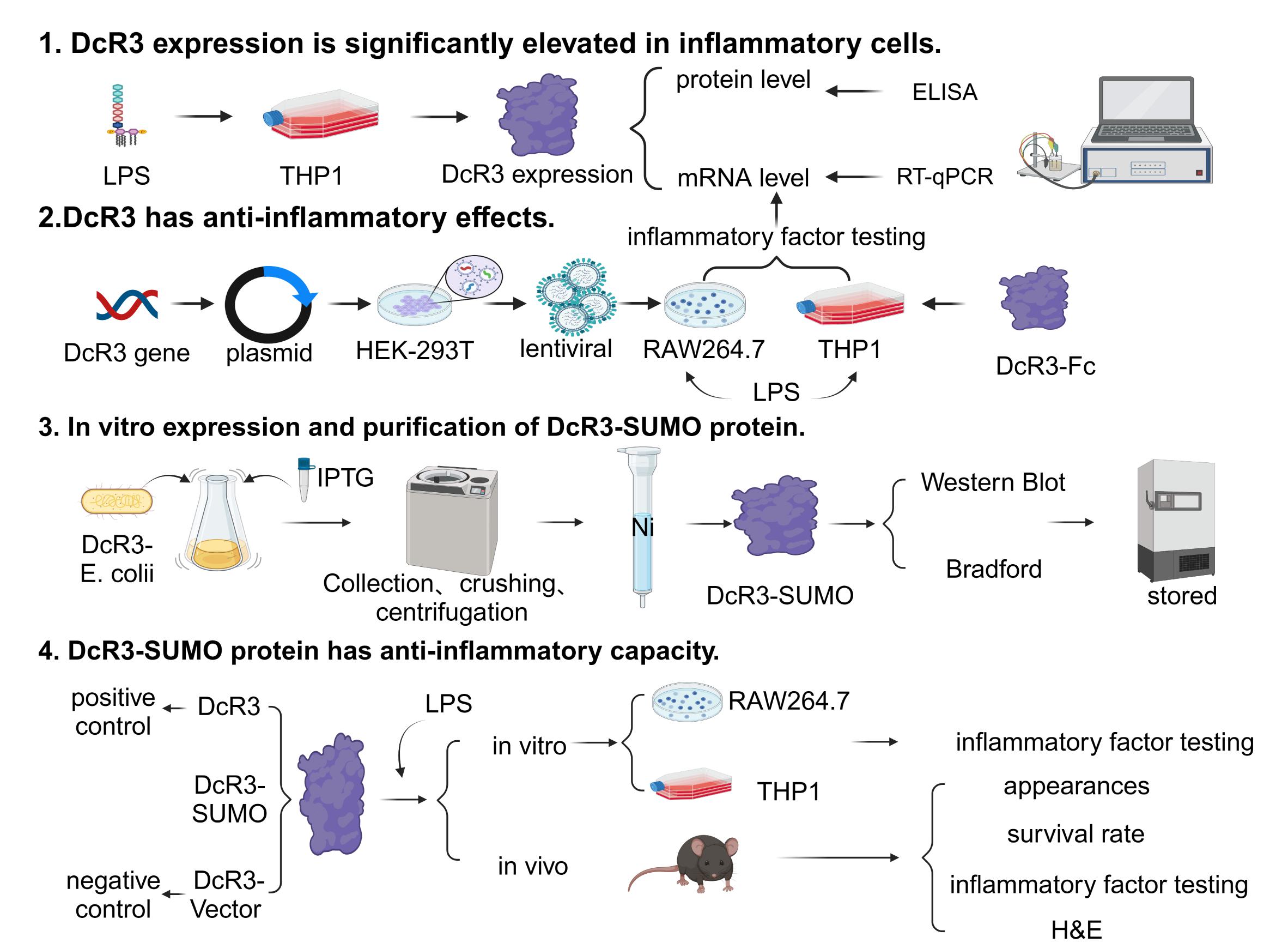 我校生命科学学院、南方生物医学研究中心苏经迁副教授课题组的前期研究表明,DcR3可通过减轻全身炎症反应抑制过度免疫反应,从而改善脓毒症。这一重要成果已于2024年5月发表在国际微生物学与免疫学领域顶级期刊《mBio》。与此同时,课题组通过结构改造和筛选,成功获得了DcR3的类似物——DcR3-SUMO蛋白。