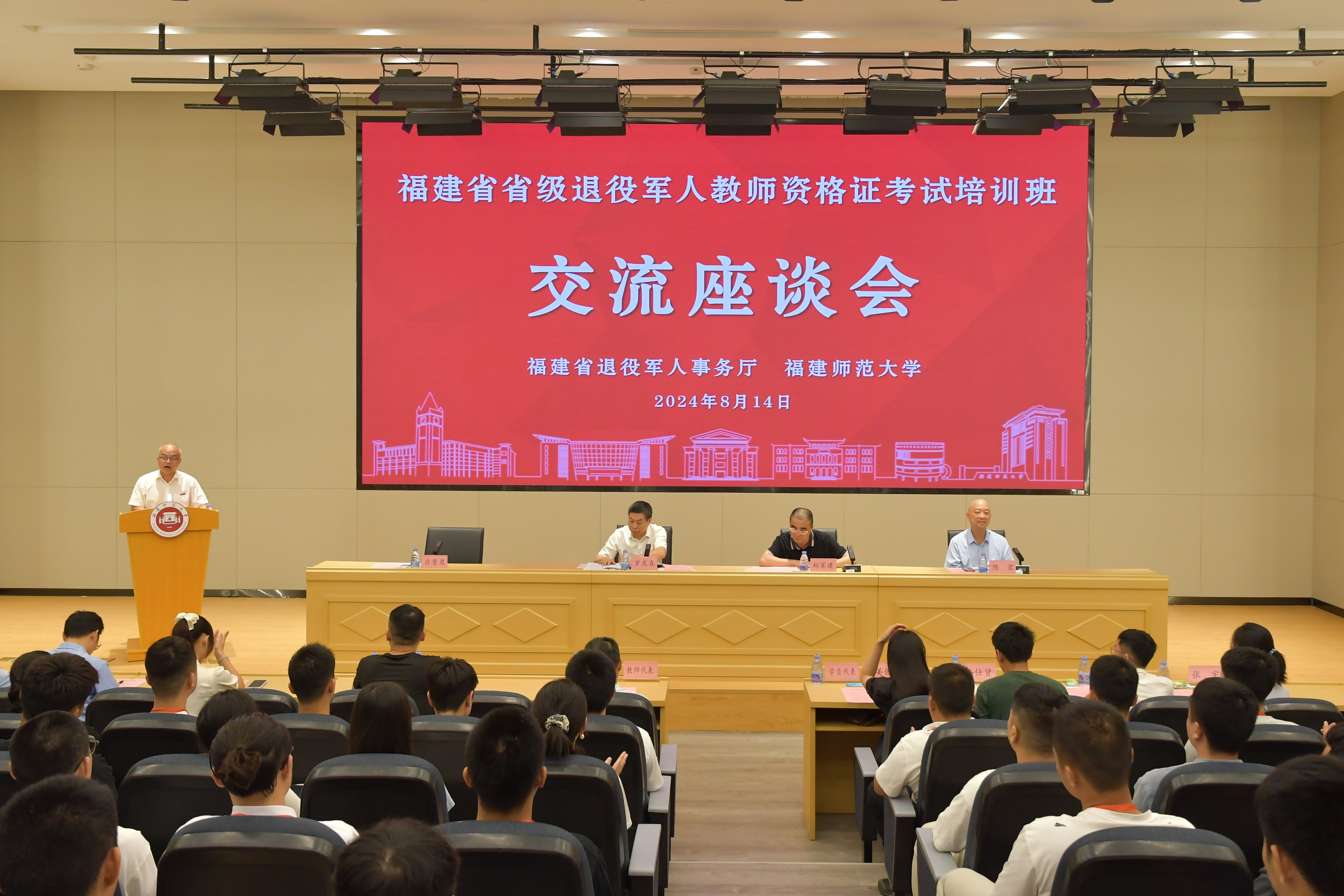 会议于8月14日在我校仓山校区举行。省退役军人事务厅党组书记、厅长罗庆春,我校副校长郑家建,省退役军人事务厅安置就业处陈宏处长及有关工作负责人,网络与继续教育学院(培训学院)负责人,教师、学员代表,第二期省级退役军人教师资格证考试培训班全体学员等共100余人参加了座谈会。