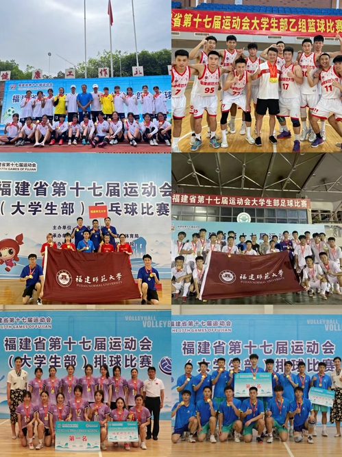 7月9日-17日,我校学子在福建省第十七届运动会各项赛事中表现出色,取得优异成绩。其中,校男子篮球队获福建省第十七届运动会(大学生部)篮球比赛乙组冠军,女子篮球队获乙组亚军;校男子足球队获福建省第十七届运动会(大学生部)足球比赛乙组冠军,女子足球队获甲B女子组冠军;校男子排球队、女子排球队均获福建省第十七届运动会(大学生部)乙组冠军;校乒乓球队获福建省第十七届运动会(大学生部)乙组女子团体赛冠军,女子双打第一名、女子单打第一名。