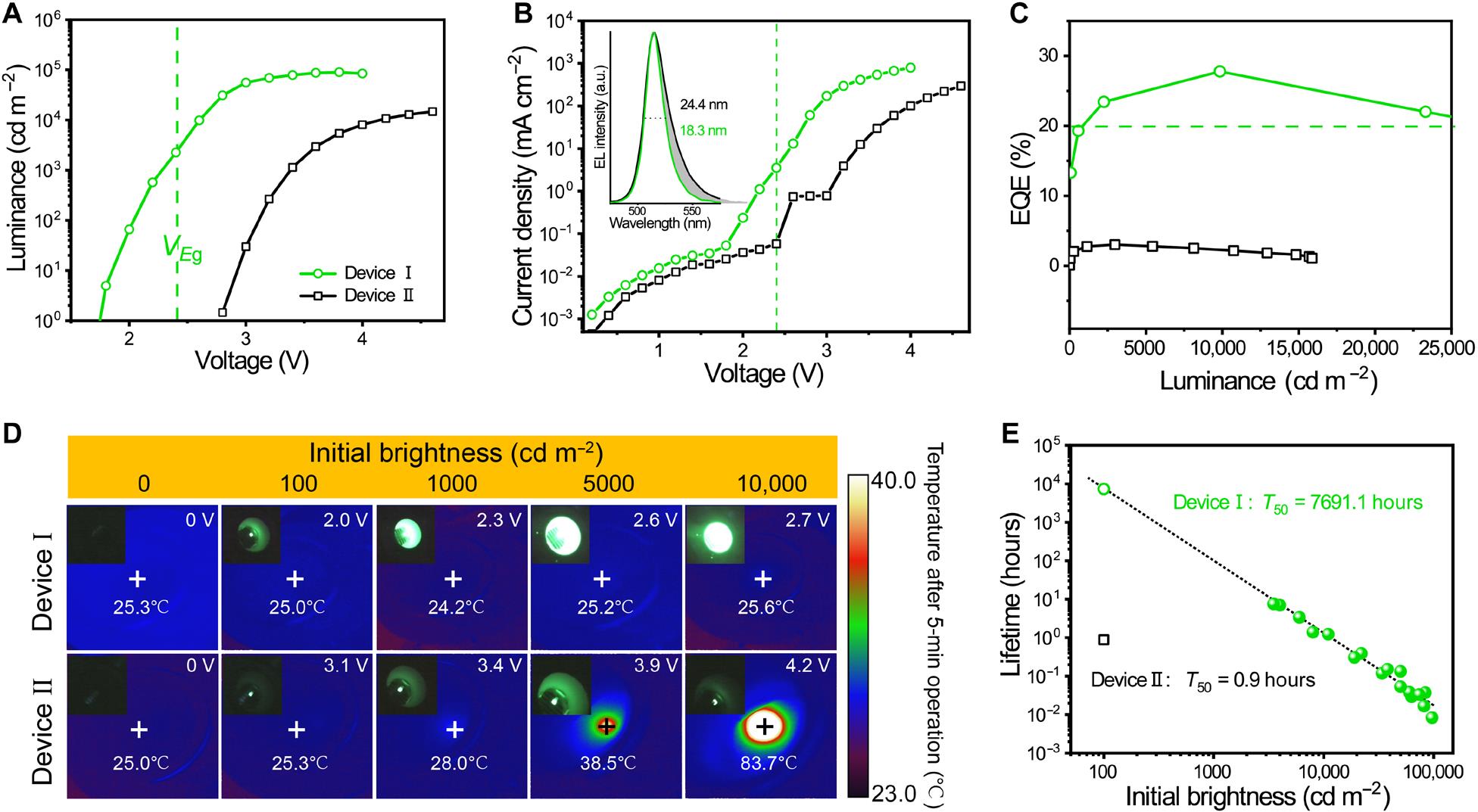 鉴于此,我校陈大钦课题组从“亚带隙发光”这一现象出发,利用“热辅助上转换发光”的原理,旨在将PeLED保持在低电压范围内运行,通过低驱动电压下获得超高的亮度和效率,从而抑制器件内禀的焦耳热。最终,绿光PeLED展现出仅为1.7 V的低启亮电压,最高亮度和EQE分别达到90295 cd m-2和27.8%。这种具有超低驱动电压的PeLED器件在100-10,000 cd m-2亮度范围内持续点亮过程中,未观察到发热现象。焦耳热的有效抑制将器件工作寿命大大延长至7690小时。该策略提出的通过抑制器件内禀的焦耳热延长器件的运行寿命,为高效稳定的PeLEDs的发展提供了崭新的思路。