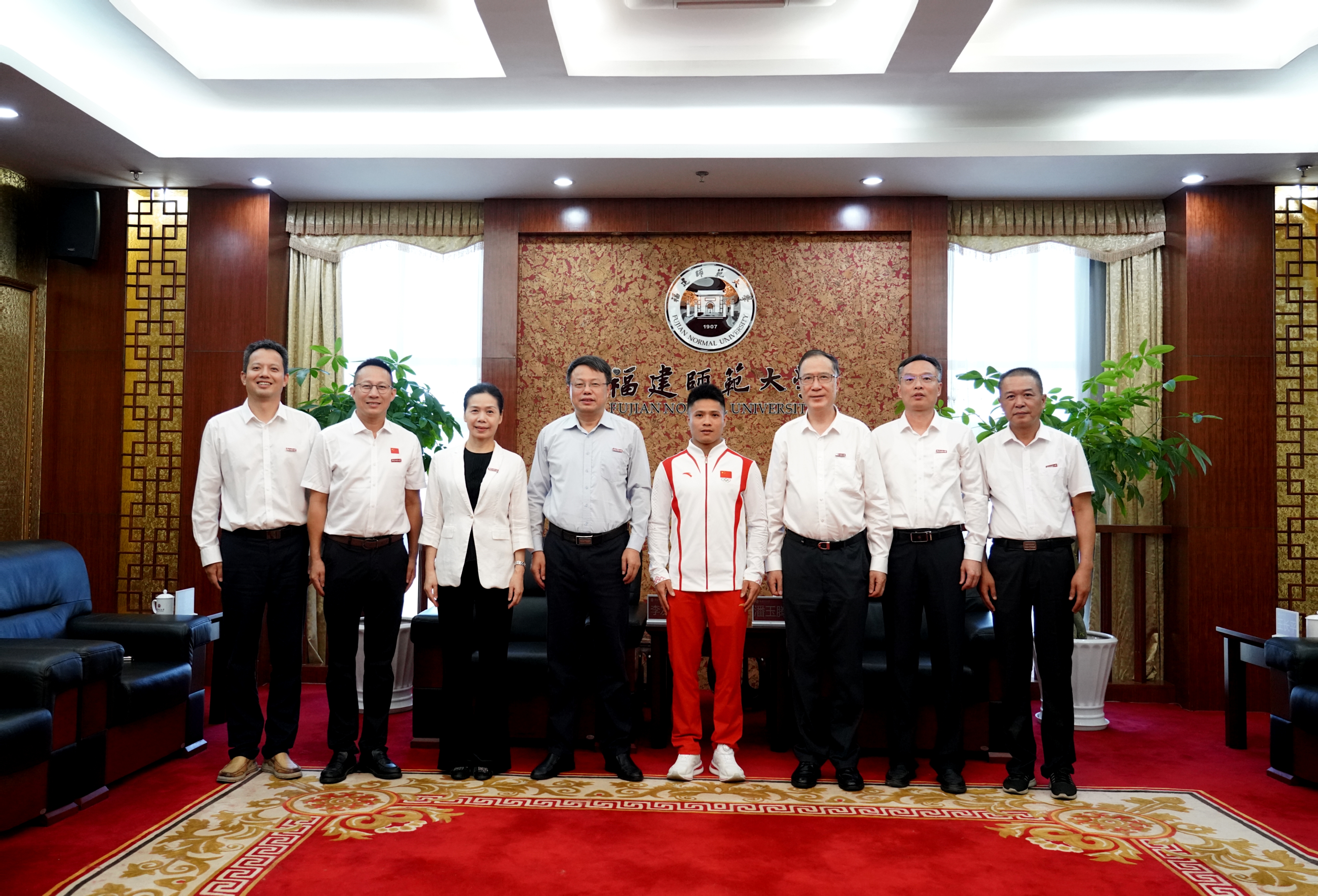 9月9日,校党委书记潘玉腾、校长王长平、校党委副书记陈晓红在旗山校区会见了我校2017届运动训练专业校友、第33届巴黎奥运会举重男子61公斤级冠军李发彬。党政办公室、统战部(校友会)、学生工作部、体育科学学院负责人陪同会见。