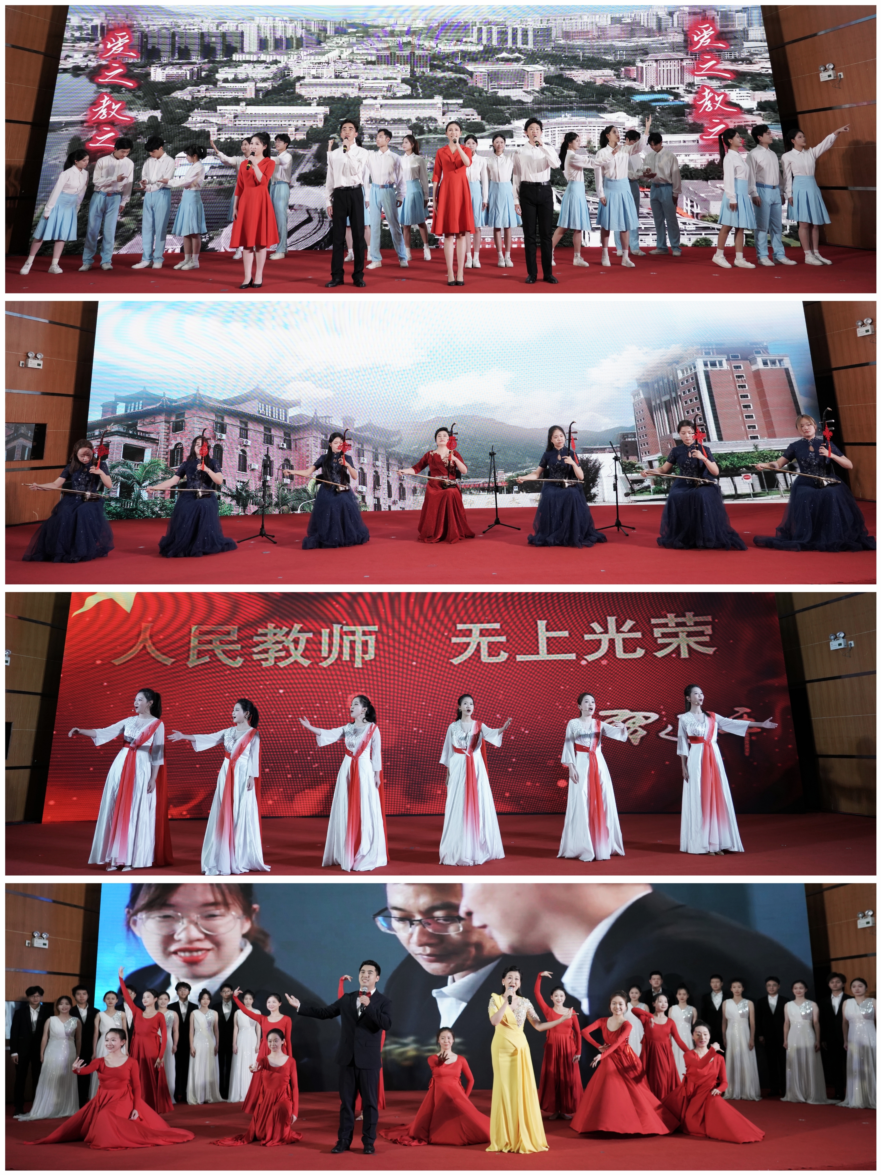最后,师生们通过诗朗诵《师恩难忘》、二胡齐奏《仓旗同乐》、演唱《不忘初心》和歌舞合唱《春风似您 繁华有我》等精彩纷呈的节目,展现了我校教师潜心育人铸师魂、以德润心助成长的精神传承,致敬全体教师们平实中的温暖、朴素中的坚守、无言中的奉献。