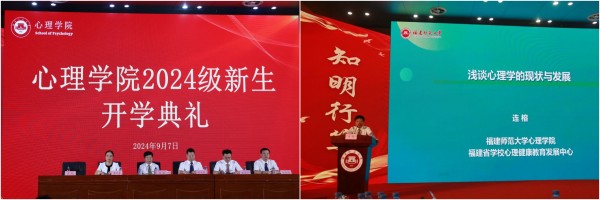 典礼结束后,心理学院首任院长、心理学一级学科博士点学术带头人连榕教授为新生讲授开学第一课。他通过梳理心理学三个重要发展阶段的内容,展示了心理学最新研究趋势和方向,启迪新生思考,助力他们更快融入专业,鼓励同学们提高内在素质,锤炼过硬本领,珍惜韶华、不负青春。