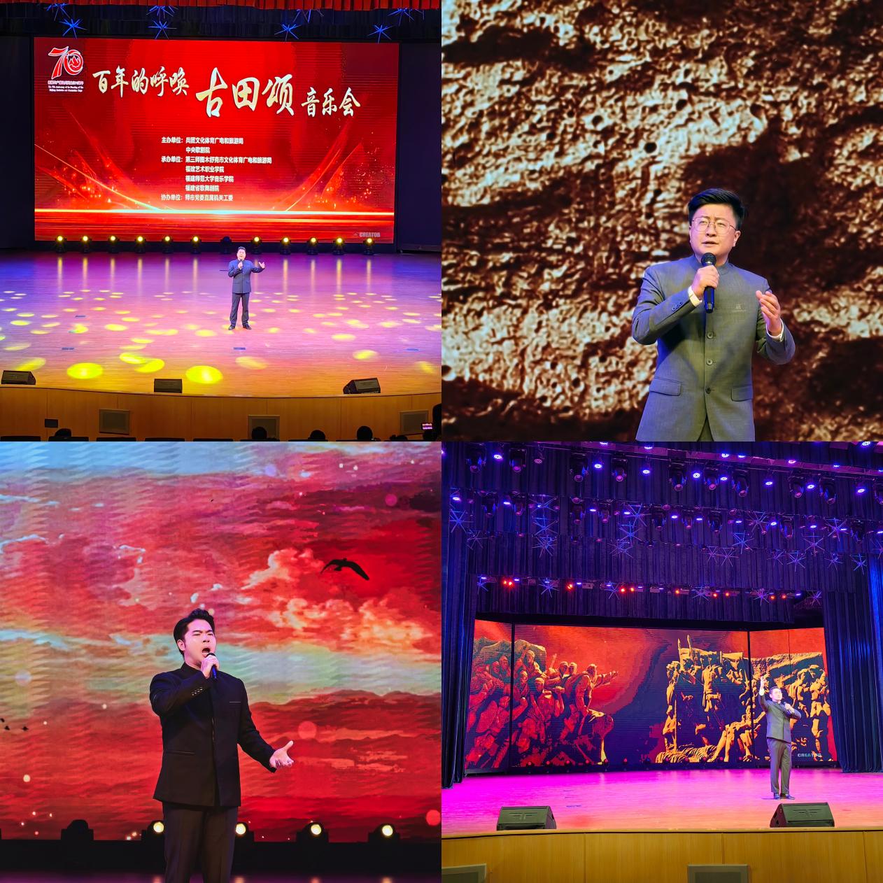 为庆祝新疆生产建设兵团成立70周年,由兵团文化体育广电和旅游局、中央歌剧院主办,师市文化体育广电和旅游局、福建艺术职业学院、我校音乐学院、福建省歌舞剧院承办的大型原创组歌“百年的呼唤——《古田颂》”声乐专场音乐会,于9月12日、13日晚在新疆图木舒克市唐王城剧场举办。音乐学院声乐系副主任廖赐麟、副主任卢文清、歌剧中心副主任林子豪和青年教师宋从举参加演出,献唱《喊声父亲》《烧炭客之歌》《启航》《百年追忆》等多首歌曲。