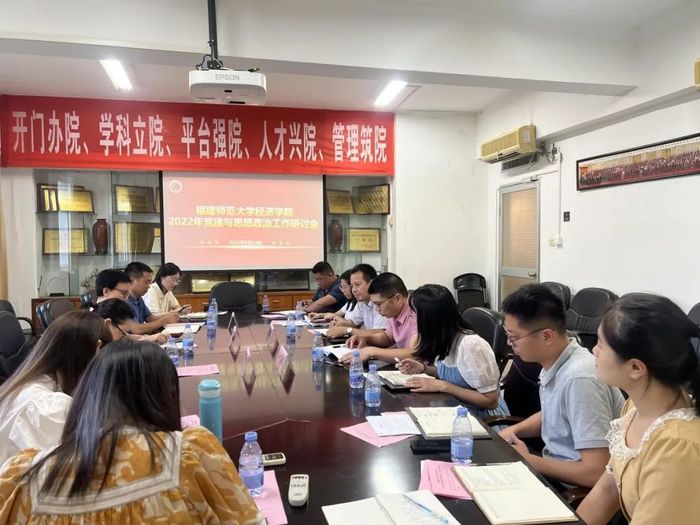 近日,经济学院召开2022年暑期党建与思想政治工作研讨会。校党委组织部副部长阮传瞰,校学工部副部长陈秋华,校团委副书记吴小英,经济学院党委书记颜隆忠,组织员、全体专兼职辅导员参加了会议。会议由党委副书记叶龙祥主持。