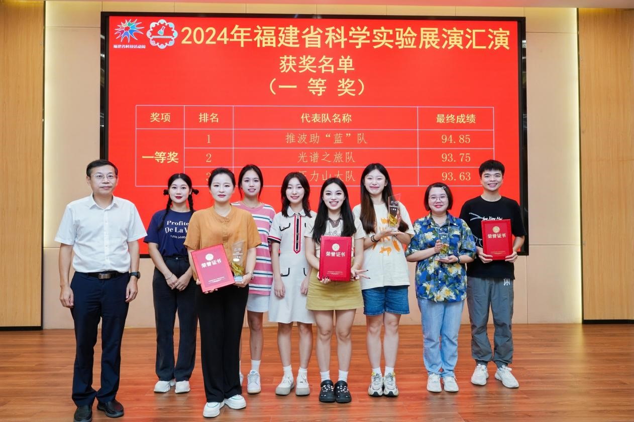 近日,2024年福建省科学实验展演汇演活动在闽江师范高等专科学校举行,光电学院2023级科学与技术教育专业研究生贺紫薇、吴楠、陶然、靳婉琪组成的“推波助‘蓝’队”荣获一等奖,并将代表福建省参加全国大赛。该活动以“弘扬科学家精神,激发全社会创新活力”为主题,分为实验展示和知识问答两个环节,共有来自不同单位的22支队伍参加。(光电与信息工程学院)