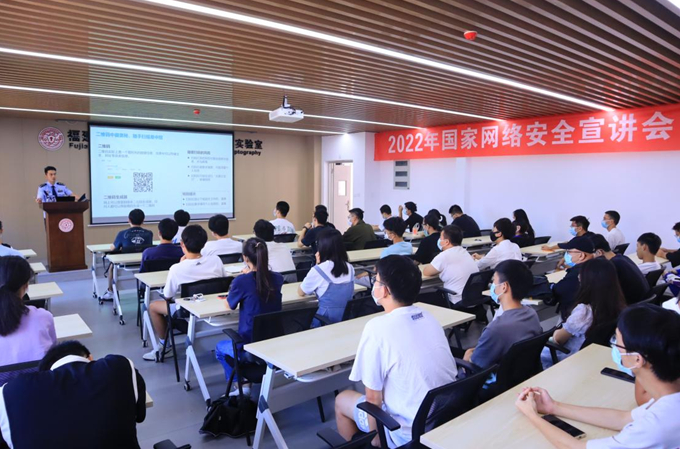 9月8日,计算机与网络空间安全学院联合福州市公安局上街(高新区)分局在福建省网络安全与密码技术重点实验室学术报告厅举办国家网络安全宣讲会。福州市公安局上街(高新区)分局许杰峰警官为2021级网络空间安全专业学生讲授上网安全、网络暴力防治、个人信息保护、微信泄密隐患等网络安全相关知识,并用生动的案例情景讲述了生活中可能出现的电信网络诈骗和网络安全风险。