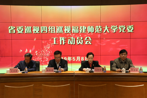 根据省委巡视工作统一部署,省委巡视四组于2019年5月8日起进驻福建师范大学,对学校党委开展为期40天左右的巡视。5月8日上午,省委巡视四组巡视福建师范大学党委工作动员会在旗山校区召开。省委巡视工作领导小组成员、省委组织部副部长兼省委非公企业和社会组织工委书记林承通,省纪委常委、省委巡视四组组长、正厅级巡视专员冯新婷,省委巡视四组副组长刘启焱,省委巡视四组以及配合本次巡视工作的意识形态工作专项检查组的全体干部,校领导,外派厅级干部、部分原离退休校领导,全校中层干部,附属学校、校医院党政负责人,校档案馆负责人,教师代表、学生代表等参加了本次动员会。动员会由校党委书记李宝银主持。