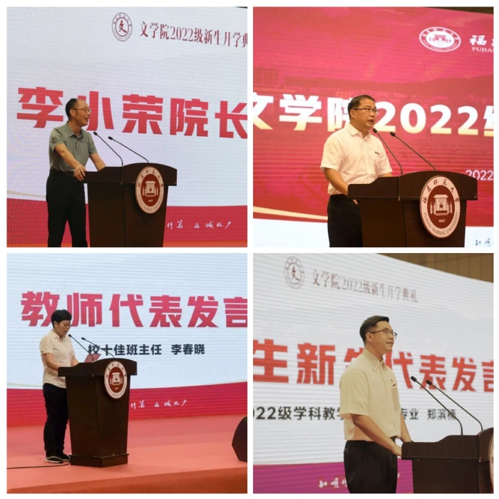 校“十佳班主任”李春晓、2020级孙绍振中国语言文学拔尖学生培养基地班余雪婷、2022级学科教学(语文)专业郑滨楠、2022级本科汉语言文学专业杨诺然作为教师代表、老生代表、研究生新生代表和本科生新生代表分别发言。