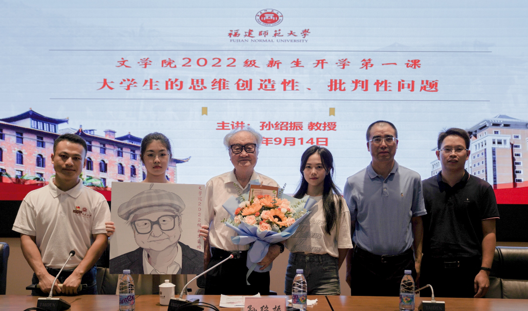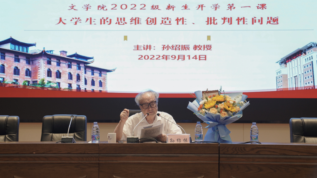 9月14日,我校文学院2022级新生开学第一课在仓山校区邵逸夫楼学术报告厅举行,著名文艺理论家、全国高校黄大年式教师团队领衔专家、我校文科资深教授孙绍振教授为新生授课,副校长郑家建,学院党政班子、全体教职工以及2022级全体新生参加。