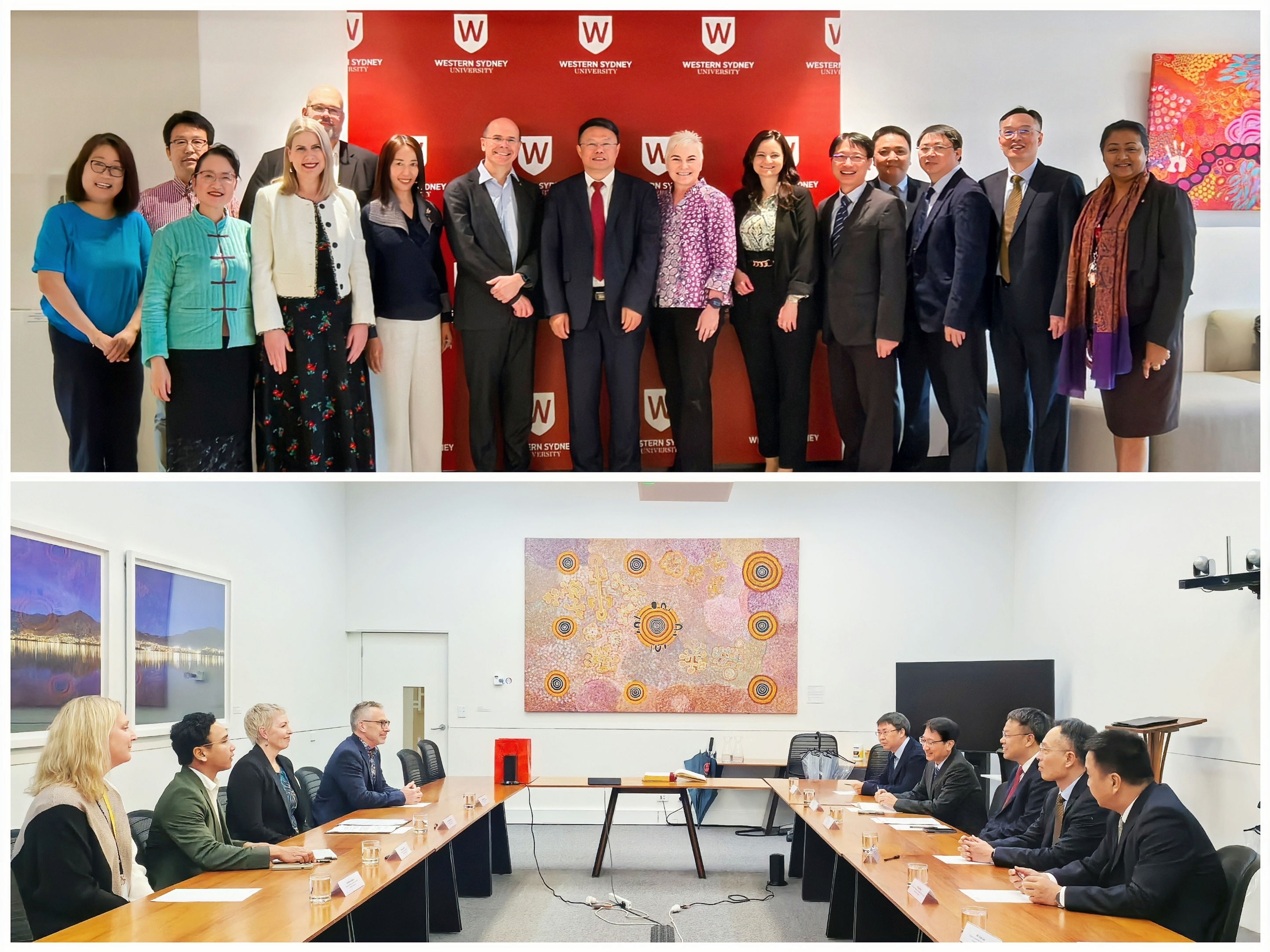 在澳大利亚,西悉尼大学校长乔治∙威廉、副校长尼科琳∙默多克对代表团的到访表示欢迎,积极评价双方合作取得的成果,表示将持续推动两校交流合作。潘玉腾表示,西悉尼大学是我校重要合作伙伴之一,希望双方加强对接、深化合作,拓宽本硕联合培养项目的学科领域和办学层次,助推国际化人才培养和中澳教育文化交流创新发展。会谈期间,双方就开展师生科研实践学术交流进行讨论并达成初步共识。在塔斯马尼亚大学,代表团与国际学院院长梅拉妮·布莱恩特教授、交换生与海外研修部主任、合作伙伴与合作项目办公室主任、国际事务部主管等进行了会谈。两校合作历史悠久,其所在地友好省州关系已长达43年。双方一致同意赓续友谊、推进合作,围绕人文地理、艺术音乐、海洋及生物等领域开展各层次人才培养和跨学科创新,共同推动各项合作取得更多实质性成果。
