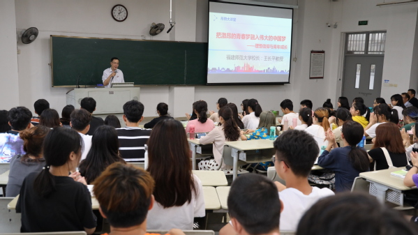 5月27日下午,校长王长平教授在旗山校区立诚1-106教室,为2017级图书馆学、信息管理与信息系统、学前教育等专业学生上题为《把激昂的青春梦融入伟大的中国梦》的思想政治理论课。王长平结合自己的求学成长和工作经历,与同学们分享了关于青年成长成才的体会,探讨分析了大学教育的现状与未来。他指出,青年学生是国家的希望、民族的未来,人生黄金期同“两个一百年”奋斗目标的轨迹完全吻合,生逢其时,重任在肩。要有责任担当意识,主动扛起促进国家未来发展的重担;要有高远的人生定位,形成理想信仰的大视野、大格局;要珍惜青春的美好时光,在自己的专业领域有所作为、有所收获,成为高素质专业人才。他说,一代人有一代人的使命,一代人有一代人的担当,希望同学们既要仰望星空,又要脚踏实地,自觉把自己的青春梦融入到伟大的中国梦之中,一步一个脚印地实现自己的人生梦想,努力为实现“两个一百年”奋斗目标贡献更多青春力量。