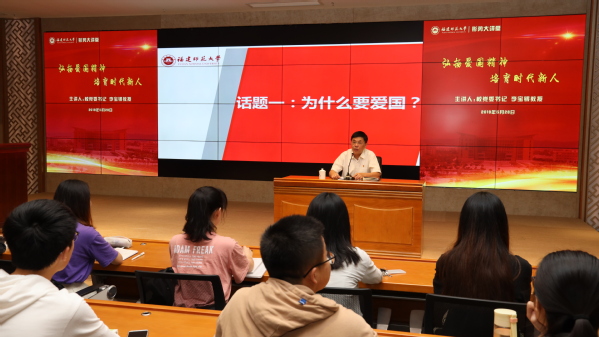 5月28日上午,校党委书记李宝银教授在旗山校区宏达厅,为经济学院2017级工商管理大类学生上题为《弘扬爱国精神 培育时代新人》的思想政治理论课。李宝银结合学习贯彻习近平总书记在纪念五四运动100周年大会上的重要讲话精神,围绕“为什么要爱国”和“新时代青年如何爱国”两个话题,与青年学生进行了对话交流。他指出,国家是国际竞争的主体、人民幸福的保障、民族复兴的基础、人民的精神家园,爱国主义是中国生生不息的力量源泉,全球化时代需要爱国精神,新时代青年学生作为“强国一代”,要增强“四个意识”,坚定“四个自信”,做到“两个维护”,理性爱国,真诚爱国,树立人类命运共同体的思想和符合时代要求的爱国精神,自觉维护国家和民族的根本利益、长远利益和核心利益。他勉励同学们大力弘扬和践行五四精神,将个人理想和祖国前途紧密联系起来,树立远大理想、涵养家国情怀,练就过硬本领、勇于担当奉献,创新创业创造、坚持永久奋斗,努力成为担当民族复兴大任的时代新人。