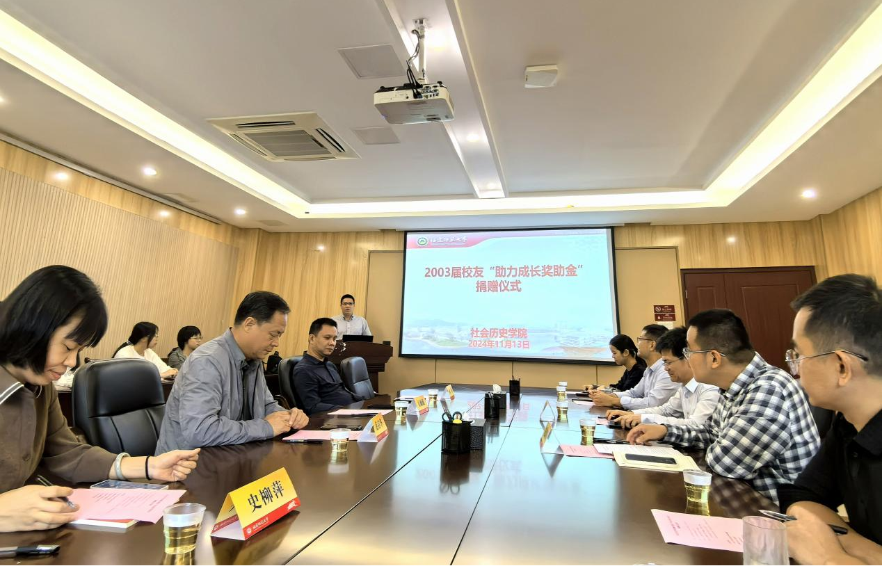 11月13日,社会历史学院2003届校友“助力成长奖助金”捐赠仪式在领先楼309会议室举行。校友会副秘书长、教育基金会理事长范启华,学院2003届校友代表校图书馆馆长吴巍巍、学院党委书记陈尚旺以及教务处、学院师生代表等参加仪式。仪式由院党委副书记范瑞锭主持。