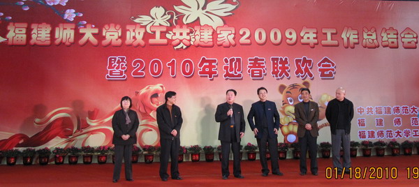 1月18日晚,我校在仓山校区综合体育馆举行党政工共建家2009年工作总结会暨2010年迎春联欢会。校领导张金栋、黄汉升、游小波、黄锦平、李敏、许明,原校领导,原校长助理,各单位党政工主要负责人,省人大、省政协委员,各民主党派、统战团体、无党派人士联谊会负责人,国家有突出贡献中青年专家,省优秀专家,博士生导师,校关工委负责人,原校工会专职主席,福清分校、人武学院、附中、附小党政工负责人,校工会、教代会委员、经审委员,各部门工会主席,师生代表300余人参加了联欢会。