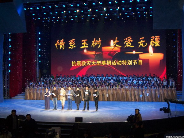 我校音乐学院合唱团积极参加了这场大型的赈灾晚会。合唱团师生们参演了《玉树还远吗》、《凝聚这份爱》、《相亲相爱》、《感恩的心》、《祖国不会忘记》等8个节目,与两岸三地演艺界的300名老艺术家、体育明星、戏曲歌唱演员同台演出。大家情系玉树,以实际行动表达对灾区人民的支援和慰问之情。