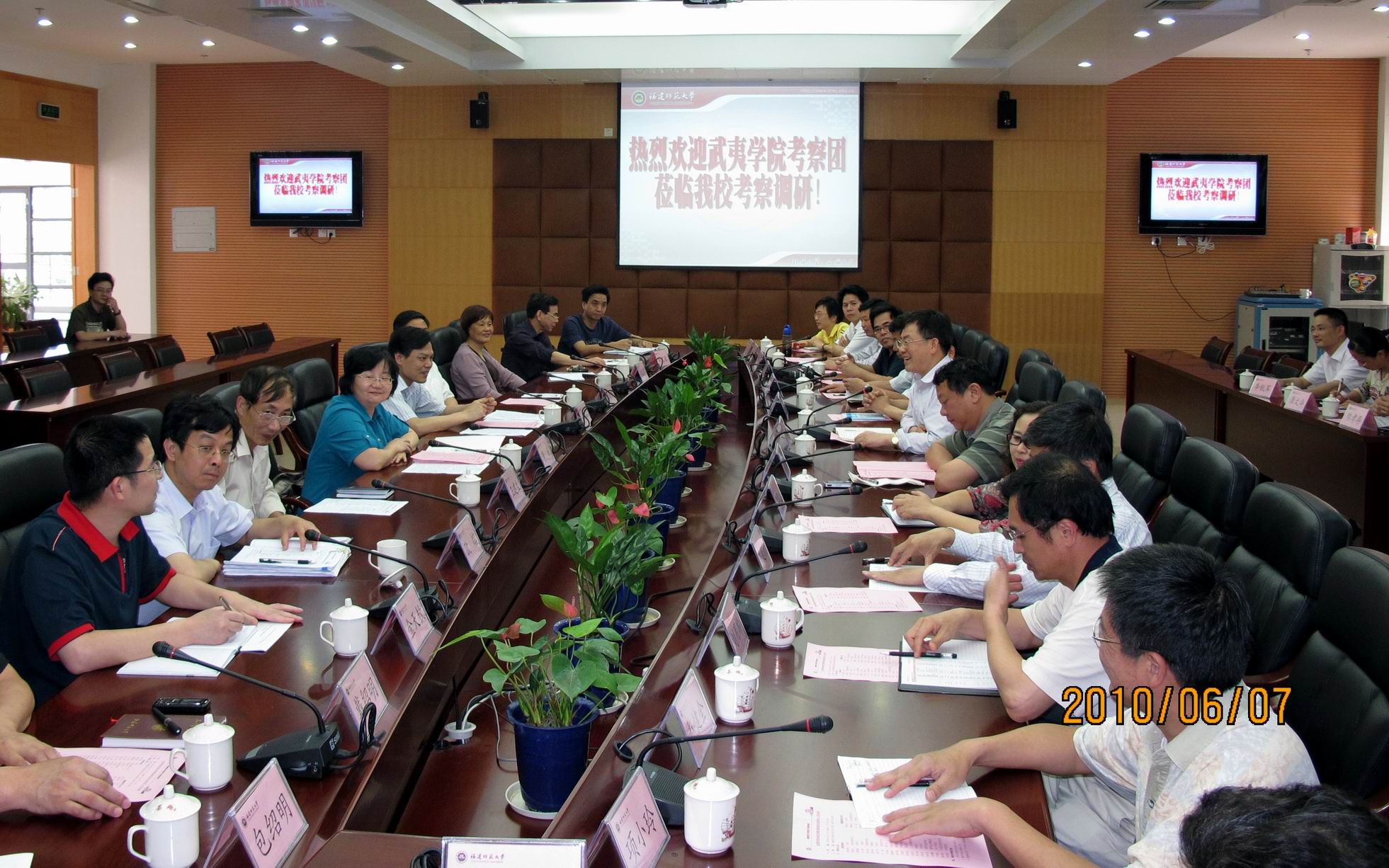 67下午,武夷学院校长杨江帆、党委副书记姚进生、副校长高建富率相关部门、院(系)负责人一行23人来校考察交流。校领导黄汉升、黄锦平、李敏先后会见了杨江帆一行,学校办公室、监察处、审计处、人事处、教务处、财务处、资产处、后勤管理处、继续教育学院等相关单位负责人参加了会见。