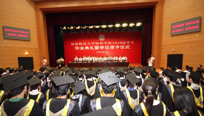 典礼上,袁勇麟院长宣读了《福建师范大学协和学院关于准予2010届1462名本科学生毕业的决定》、许明副校长宣读了《福建师范大学关于授予协和学院2010届1446名本科毕业生学士学位的决定》、院党委林玉辉副书记宣读了《福建师范大学协和学院关于表彰2010届优秀毕业生的决定》。袁勇麟院长为2010届毕业生代表颁发毕业证书;黄汉升校长为2010届毕业生代表行正冠拨穗礼并颁发学位证书,现场气氛隆重、热烈。