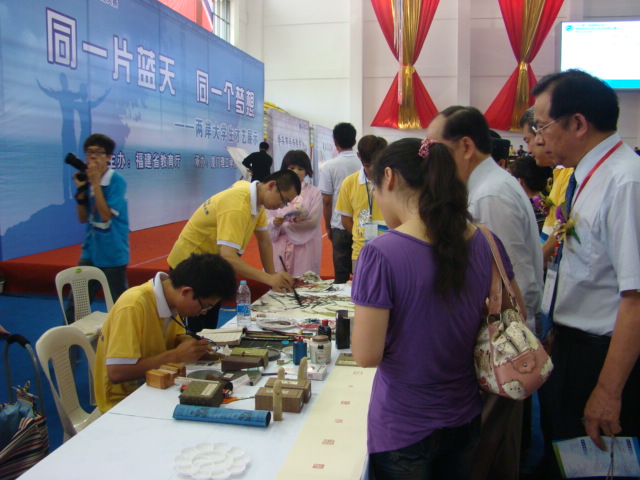 在才艺展示现场,美术学院刘宬一同学的传统书画、陈起发同学的篆刻“学子缘,海峡情”和彭偲同学的现场漫画制作,以扎实的功底和精湛的技艺,为我校赢得了活动的最佳表演奖,展示了我校青年学生的风采。闭幕式上,美术学院林晔琳同学作为大陆高校唯一学生代表上台发言。