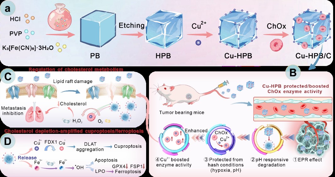 2024年,福建师范大学曾雪梅和燕双仟团队合作开发了一种生物相容性纳米平台(Cu-HPB/C)(由铜掺杂中空普鲁士蓝纳米颗粒Cu-HPB和胆固醇氧化酶ChOx组成),Cu2+掺杂的中空普鲁士蓝作为ChOx的载体、庇护所和增强剂,增强ChOx的肿瘤靶向能力、稳定性和酶活性。且肿瘤微环境响应性释放的Cu2+可显著增强ChOx活性,促进胆固醇消耗和破坏脂质筏,从而阻碍细胞侵袭和迁移。同时,氧化还原反应产生的H2O2进一步增强了Cu-HPB的化学动力学治疗效果,增加了氧化应激和铁死亡。此外,转录组测序分析结果也证实了Cu-HPB/C对胆固醇稳态的影响,并揭示了细胞死亡机制,包括氧化应激、铁死亡、铜死亡和凋亡,在小鼠转移模型中显示出较好的抑制效果,这为未来研发通过增强胆固醇消耗来有效治疗肿瘤和抑制转移提供了新的策略。