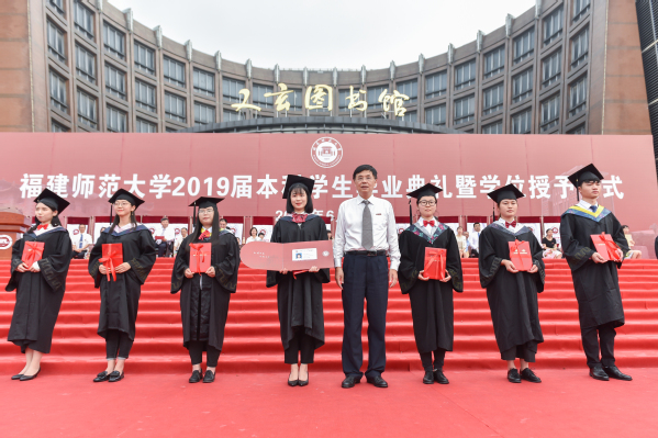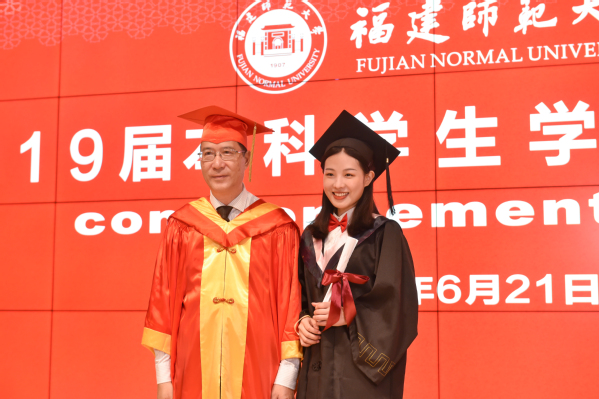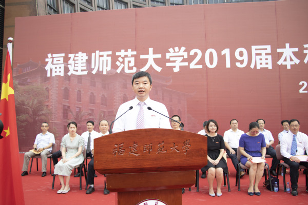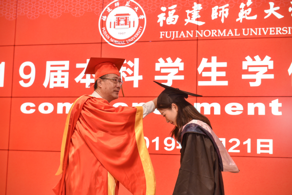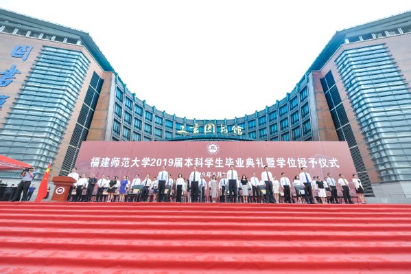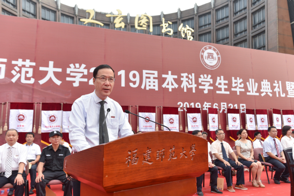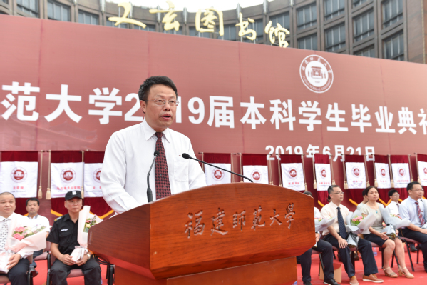副校长郑家建宣读了《福建师范大学关于准予2019届5354名本科学生毕业的决定》《福建师范大学关于授予2019届5340名本科毕业生学士学位的决定》和《福建师范大学关于表彰2019届1164名优秀毕业生的决定》。校党委副书记潘玉腾宣读了2019届毕业生班级校友联络员名单;校党委书记李宝银为2019届毕业生班级校友联络员代表颁发了聘书和校友卡;各学院优秀毕业生代表向教职工代表敬献鲜花;毕业生代表满怀豪情朗诵了原创诗歌《毕业——告别时启航》;最后,全体毕业生庄严宣誓,深情合唱《福建师范大学校歌》。