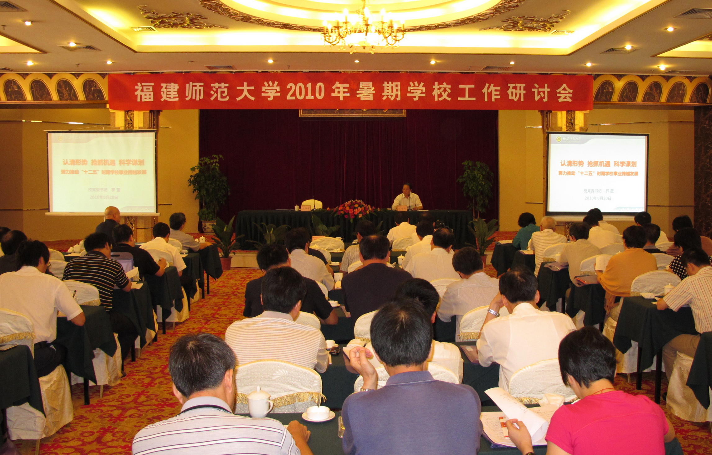 汪文顶副校长代表校党委、校行政作总结讲话。他指出,本次暑期研讨会是我校认真学习胡锦涛总书记来闽考察重要讲话精神和省委八届九次全会精神,深入贯彻国家中长期教育、人才、科技发展规划纲要和全国教育工作会议精神的一次重要会议,也是群策群力,深入研讨学校“十二五”期间改革与发展工作的一次重要会议。会议进一步统一了思想、凝聚了共识,对于科学谋划学校“十二五”时期的事业发展必将起到重要的指导作用和积极的推动作用。要求各单位认真学习好、传达好、贯彻好、落实好本次会议精神,认真制定本单位的“十二五”发展规划,同心同德,开拓创新,抢抓机遇,科学谋划,努力推动“十二五”时期学校事业跨越发展。