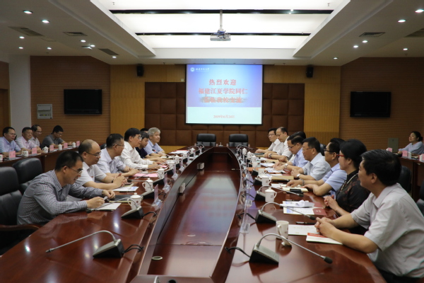 福建江夏学院党委书记郑建岚、校长陈国龙分别讲话。郑建岚书记在介绍福建江夏学院的基本情况后指出,福建师大是一所百年老校,历史悠久,积淀深厚,近年来在推动高水平大学和“双一流”建设方面取得了显著成绩,积累了丰富的管党治党、办学治校经验,值得学习借鉴。福建江夏学院和福建师大历来关系密切、友情深厚,希望我校加强指导、加大支持,推动福建江夏学院高质量内涵发展。陈国龙校长介绍了福建江夏学院未来的发展目标和当前面临的瓶颈问题,他说,福建江夏学院是新建本科高校,福建师大是百年名校,希望两校进一步深化交流、拓展合作,特别是有针对性地加强对口帮扶,助力福建江夏学院加快补齐内涵发展短板,早日建成区域一流的示范性应用型本科高校。