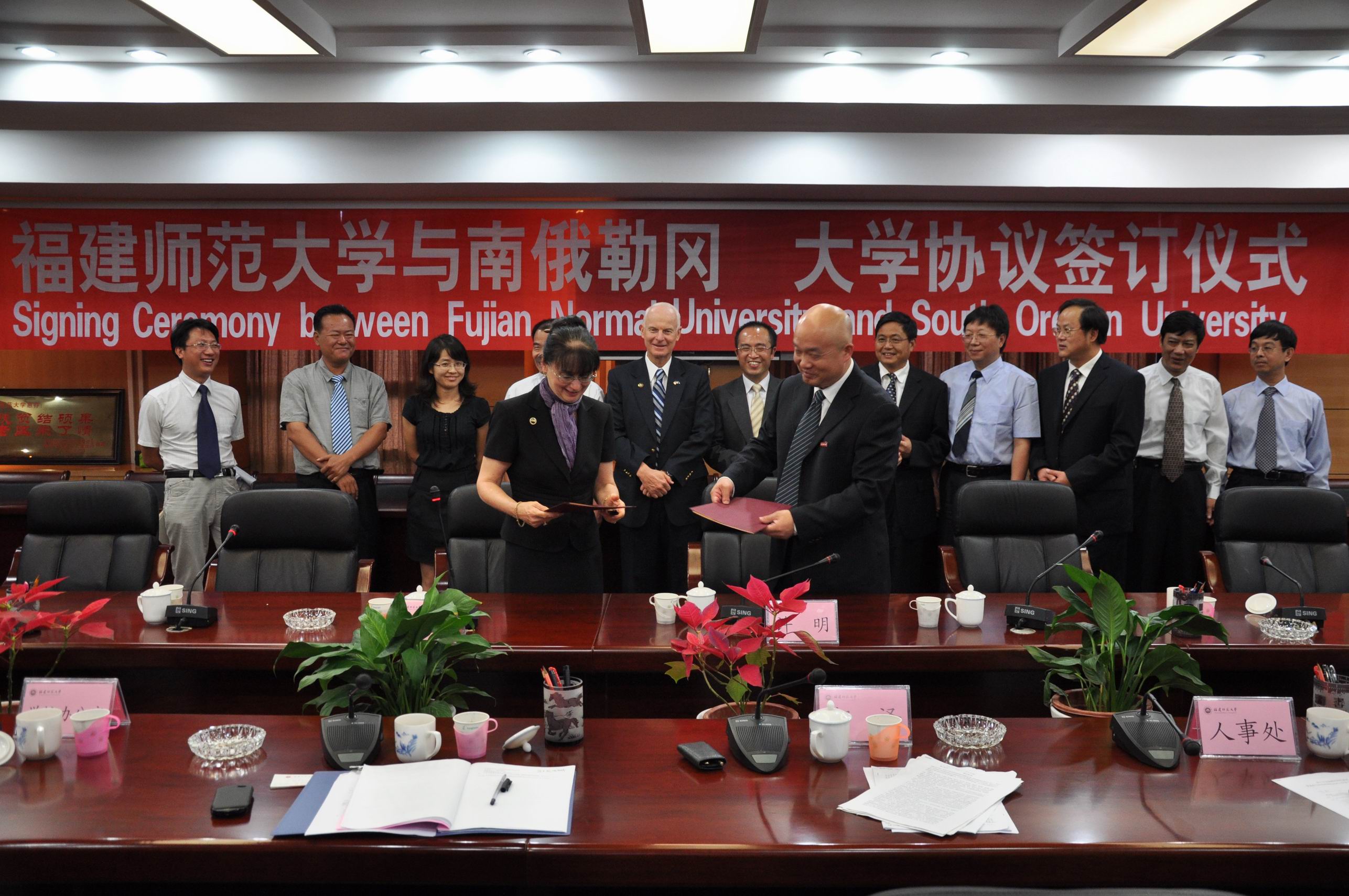 会见结束后,我校与南俄勒冈大学举行了合作协议签订仪式。双方签订了为期三年的合作协议,协议内容包括共同举办讲座、研讨会、座谈会以及开展共同培养本科生和研究生的合作项目等。