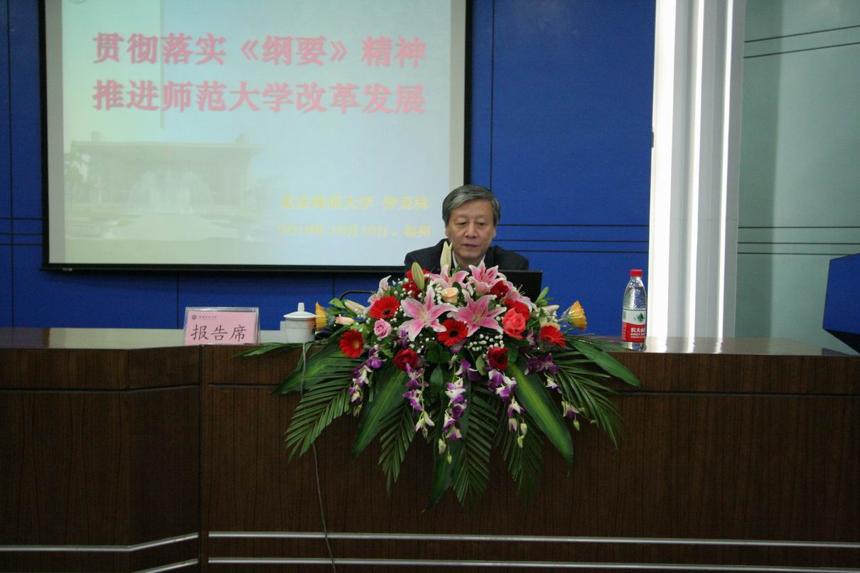 10月10日上午,我校在仓山校区邵逸夫楼学术报告厅举行校院两级中心组(扩大)学习会,邀请北京师范大学校长钟秉林教授作题为“贯彻落实《纲要》精神 推进师范大学改革发展”的专题报告。校领导,全体处级干部(含校聘),各民主党派、统战团体、无党派人士联谊会负责人,离休党总支、关工委、退休协会、老年大学负责人,机关科级干部,各学院分党委(党总支)秘书、办公室主任参加了会议。学习会由黄汉升校长主持。