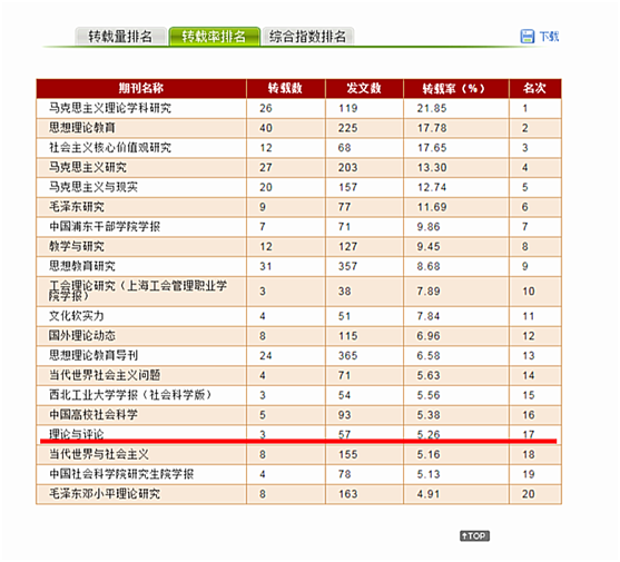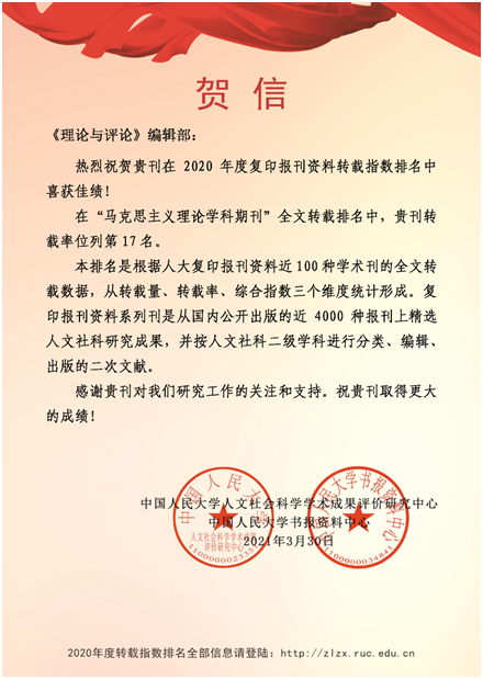 近日,中国人民大学人文社会科学学术成果评价研究中心和中国人民大学书报资料中心发布2020年度复印报刊资料转载指数排名。由福建省委宣传部主管,福建省委讲师团和我校共同主办的马克思主义理论刊物《理论与评论》,在“马克思主义理论学科期刊”全文转载排名中,转载率位列全国第17名。本排名是根据人大复印报刊资料100种学术刊的全文转载数据,从转载量、转载率、综合指数三个维度统计形成。 (社会科学处 马克思主义学院)