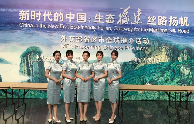 7月5日,“新时代的中国:生态福建,丝路扬帆”福建省全球推介会在外交部蓝厅成功举办,我校6名学生志愿者被选为外事讲解员参与了此次活动,负责将福建奋进故事、绿色发展、丝路繁荣、闽台融合和非遗展品等主题介绍给参会来宾。