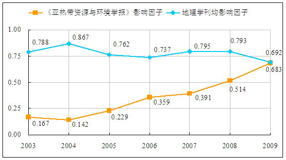 经国家新闻出版总署审核,2006年3月批准《福建地理》更名为《亚热带资源与环境学报》(福建师范大学主办)。《亚热带资源与环境学报》改刊前(2005年)的影响因子为0.229,在我国地理学28种刊物中排名第17位,在全部统计源期刊(6009种)中排名第2655位。自改刊以来,编辑部广泛与国内外同行联系,积极拓展优质稿源,严把论文质量关,提高刊物编辑水平,学报质量与学术影响力连年大幅提升。近日,万方数据(中国科学技术信息研究所引证报告依托数据库)公布的2009年度期刊评价数据显示,《亚热带资源与环境学报》影响因子成倍提高,已上升至0.683,在我国地理学29种刊物中居第9位,在全部统计源期刊(6021种)中居第922位。同时,《亚热带资源与环境学报》一直保持高他引率,2009年他引率达0.98。
