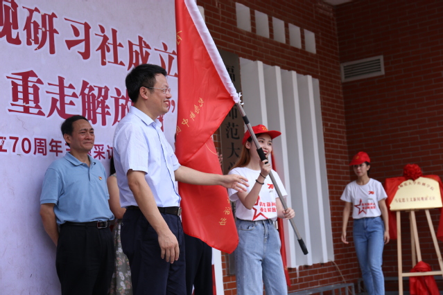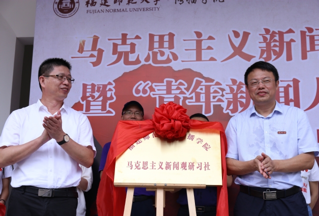 省委宣传部副巡视员卓少锋、校党委副书记潘玉腾为“福建师范大学传播学院马克思主义新闻观研习社”揭牌。参与活动的领导来宾分别为“青年新闻人重走解放路”主题采访活动五支采访队和大学生暑期“三下乡”社会实践队授旗。
