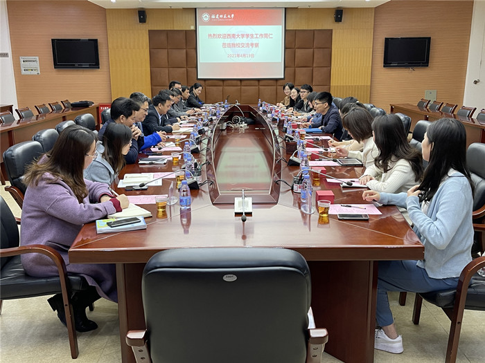 近日,西南大学学生工作部(处)部(处)长孙楚航一行11人来我校学生工作部(处)调研交流。学生工作部(处)陈祖棋、汪启思、部分学院副书记以及相关科室人员参加了座谈会。会上,陈祖棋介绍了我校的基本情况以及学生工作的相关做法及工作成效。双方就辅导员队伍建设、学生工作品牌建设、学生管理等方面进行了深入交流和讨论,相互借鉴彼此的经验与做法,希望今后能进一步加强交流。[学生工作部(处)]