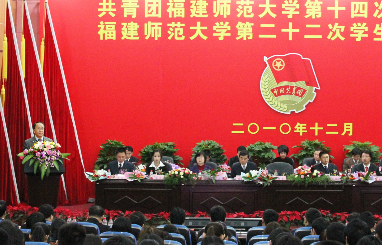宿利南代表共青团福建省委、福建省学生联合会向大会的召开表示热烈的祝贺,向我校广大青年朋友致以诚挚的问候。他以“全省高校共青团战线的一面旗帜”充分肯定了我校的团学工作,并提出三点希望:一要突出思想引领,构筑团员青年强大的精神支柱;二要注重成长服务,增强对团员青年的吸引与凝聚;三要强化自身建设,营造浓厚的学习型组织氛围。他还殷切希望我校各级团学组织秉承传统,继往开来,紧紧围绕服务跨越发展,不断开创团学工作新局面。