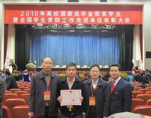 2010年全国高校国家奖学金获奖学生暨全国学生资助工作先进单位表彰大会于12月20日在北京举行。教育部、财政部、中国人民银行、银监会、中国银行、国家开发银行有关部门负责人,各省(区、市)教育部门和部分高校负责人,2009-2010学年度国家奖学金获奖学生代表以及部分在京高校师生代表约800人参加会议。省教育厅副厅长薛卫民、省学生资助管理中心主任吴选兴和我校闽南科技学院学生林艺雄代表福建省参加了会议。会上为国家奖学金获奖学生颁发了证书。 (闽南科技学院 庄天怀)