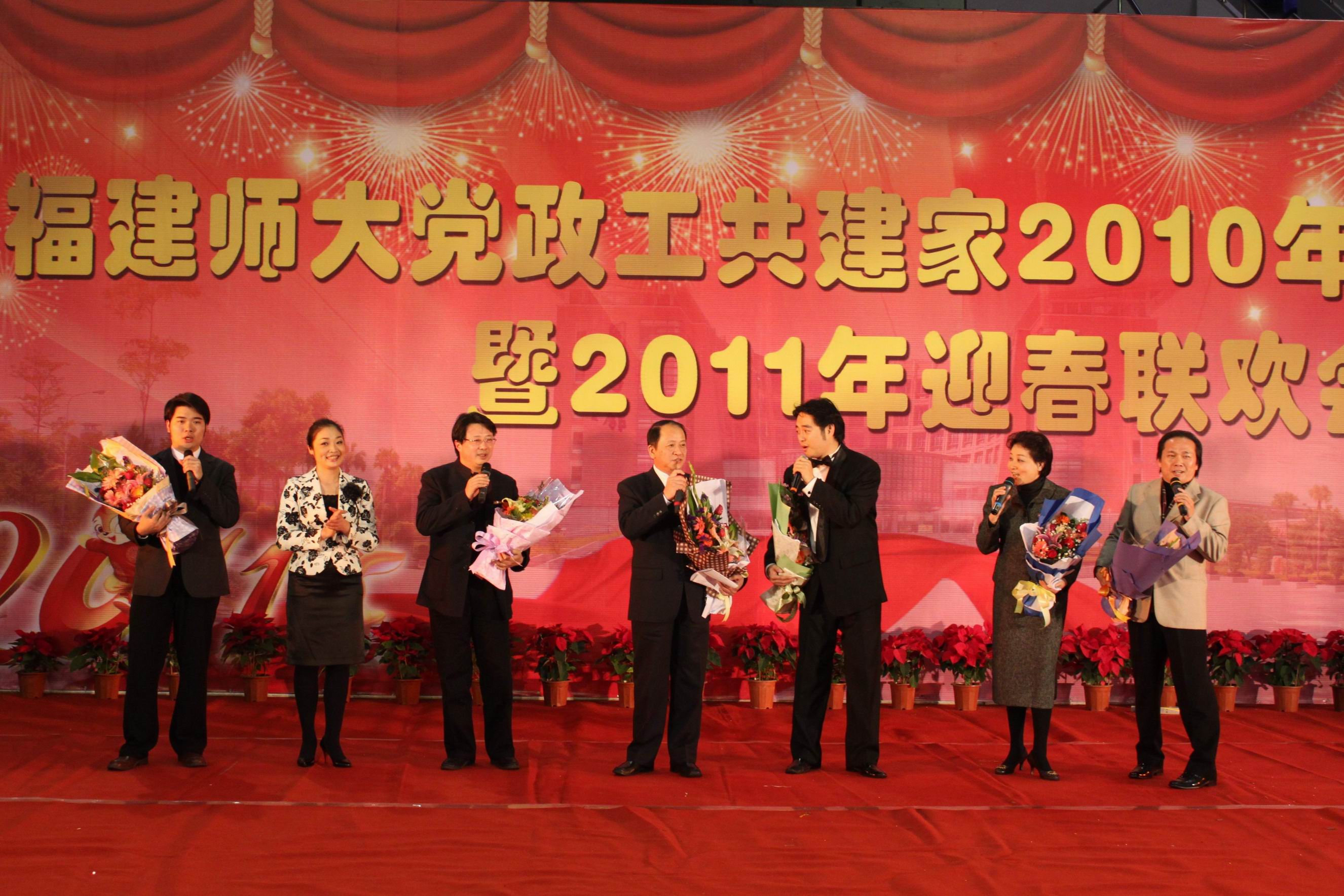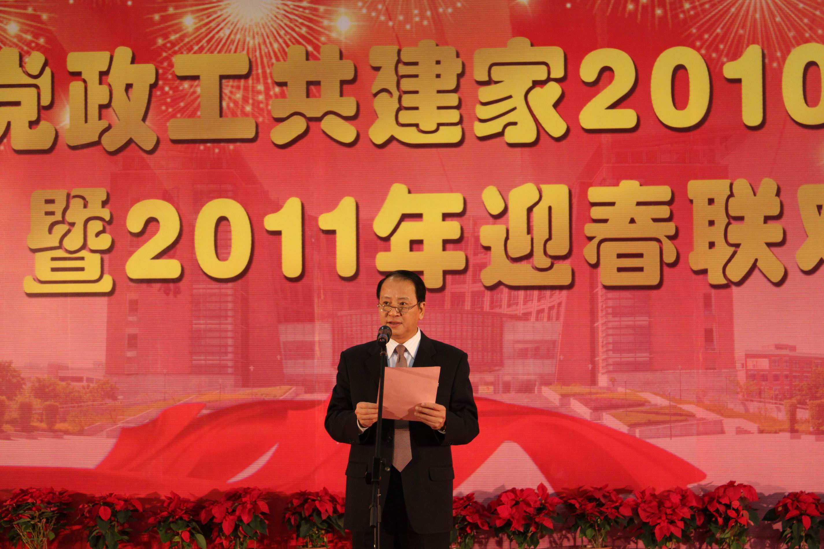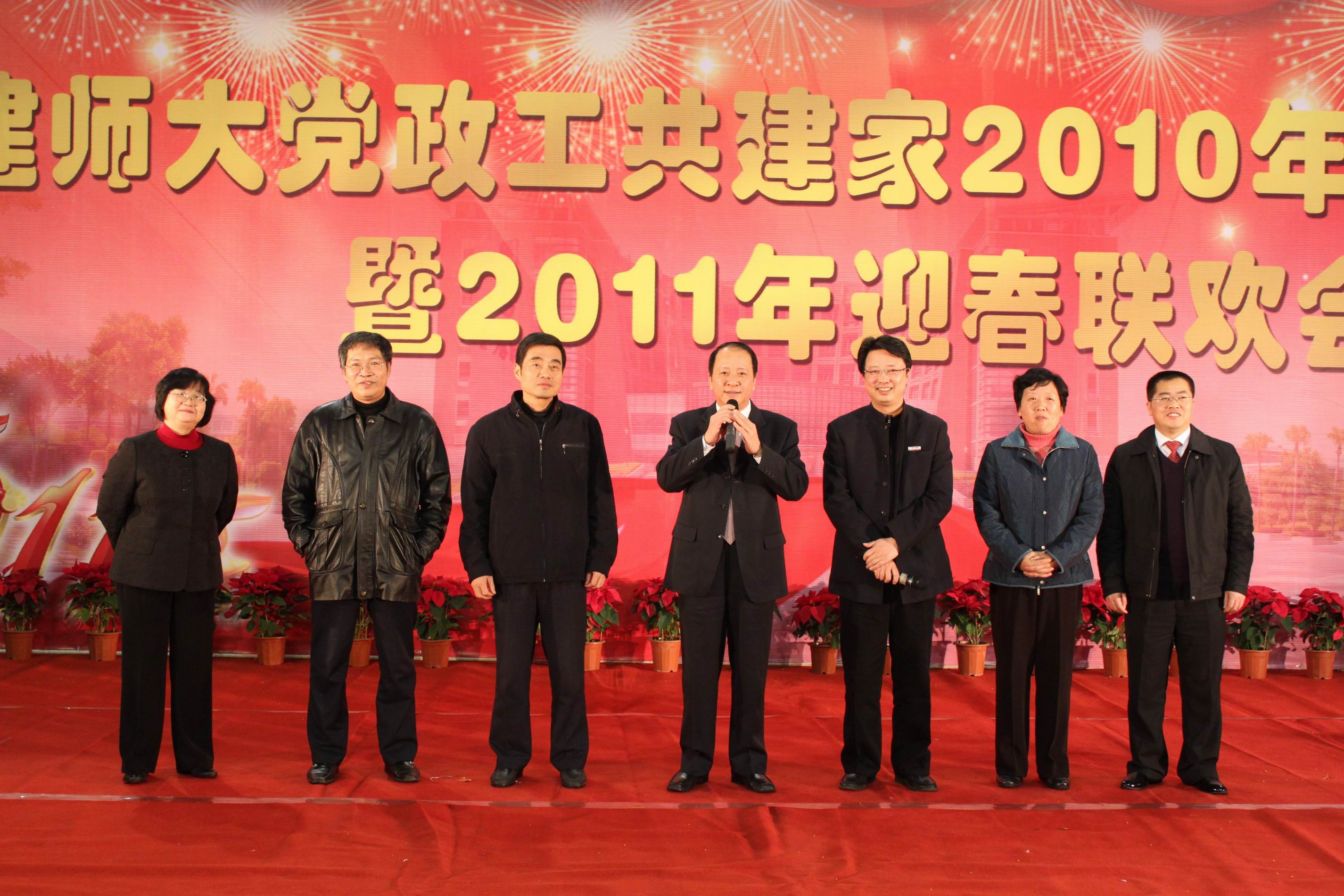 校党委书记罗萤代表校党委、校行政,向与会同志和辛勤工作在学校各条战线上的教职员工致以诚挚的问候和良好的新年祝愿。他说,刚刚过去的2010年,对福建师范大学来说是极不平凡、无比振奋的一年。在全校师生员工的共同努力下,学校各条战线捷报频传,人才培养、科学研究、学科建设、队伍建设、对外交流、党的建设、群团组织建设、统战工作、离退休工作、后勤资产改革、安全稳定等各项工作均取得了可喜成绩,为“十二五”时期学校科学发展、跨越发展奠定了坚实基础。他指出,2011年是“十二五”规划的开局之年,也是学校加强内涵建设、深化教育改革、推进教育创新、实现跨越发展的重要一年。立足新起点,我们要始终高举邓小平理论和“三个代表”重要思想的伟大旗帜,深入贯彻落实科学发展观,进一步坚定信心、振奋精神,抢抓机遇、乘势而上,以前所未有的大气魄、大智慧、大举措,推动学校各项事业再上新台阶,再创新局面,努力为加快海峡西岸经济区建设作出新的更大贡献。