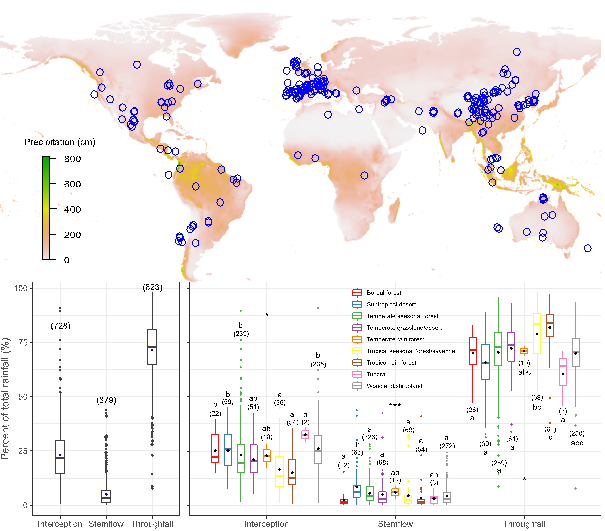 图1观测点分布图及林冠截留、树干茎流、穿透雨在全球尺度上和不同类型生态系统中的特征