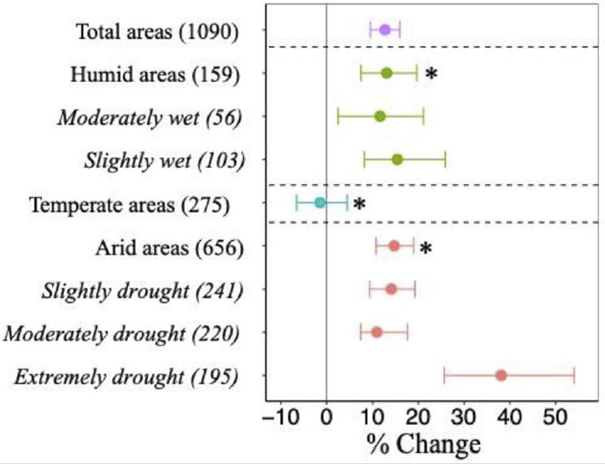 该团队通过整合分析来自全球尺度上的1090个观测值,发现降水增加在全球尺度上、非干旱区、干旱区均促进了CO2的排放,其增量分别为12.7%、13.1%和14.7%。在极度干旱区(PDSI>-3),降水增加对CO2排放的影响最为明显,其增量为38.1%。研究结果以Increased precipitation differentially changed soil CO2 efflux in arid and humid areas发表在土壤和环境类期刊Geoderma(IF=4.848)上,该课题组博士研究生谭思懿为第一作者,吴福忠教授为通讯作者,研究工作得到了国家自然科学基金优秀青年科学基金、面上项目基金等资助。