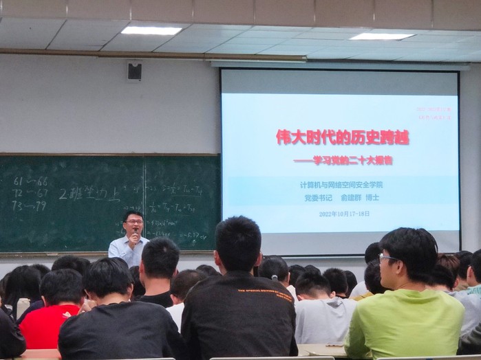 10月17日,计算机与网络空间安全学院党委书记俞建群走进大学生思政课堂,结合党的二十大报告和青年学生的思想关切、发展困惑,以“伟大时代的历史跨越”为题为青年学生上了一堂深刻而又生动的思政课。2020级计算机科学与技术专业130多位同学聆听了思政课。