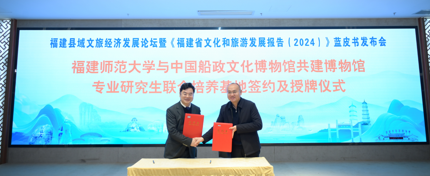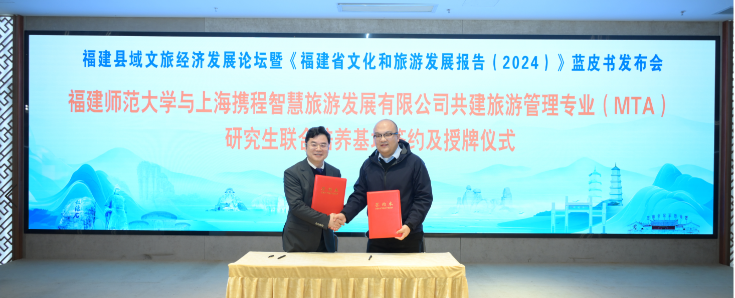 我校文化旅游与公共管理学院分别与中国船政文化博物馆、上海携程智慧旅游发展有限公司签署了共建博物馆和旅游管理专业研究生(MTA)联合培养基地协议,聘请了孙若风、白长虹为福建省文化和旅游研究联盟专家委员会委员,以及8位行业专家为校外研究生导师。