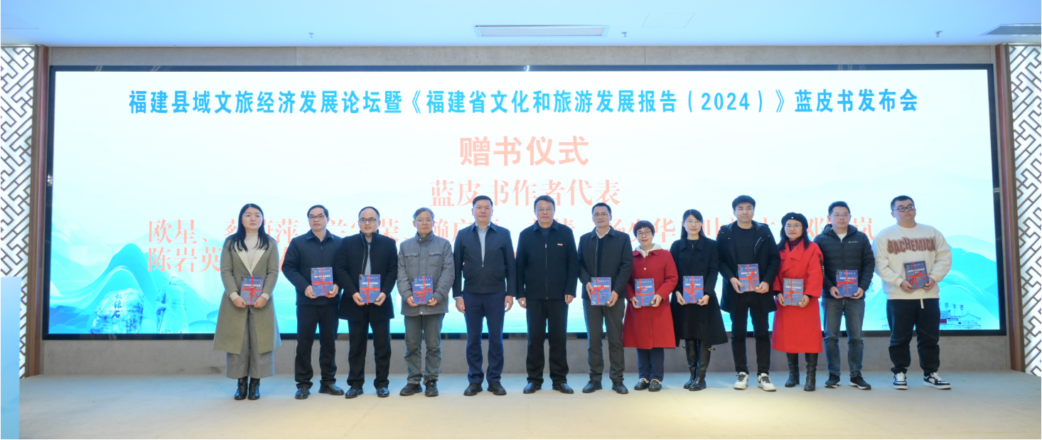 在新书发布会上,福建省文化和旅游研究联盟负责人、我校文化旅游与公共管理学院谢宏忠院长对《福建省文化和旅游发展报告(2024)》蓝皮书编纂过程进行了介绍。林守钦和潘玉腾共同为蓝皮书作者代表赠书。