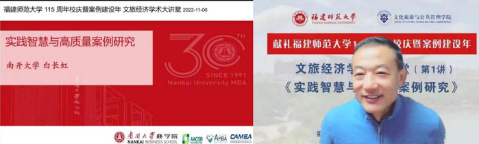11日6日,由福建省高校文旅经济学科联盟、福建省政产学研用金联盟(文旅经济)(以下简称“双联盟”)主办、文化旅游与公共管理学院承办的“文旅经济学术大讲堂”正式开启。活动邀请国务院第八届学科评议组成员(工商管理)、南开大学商学院院长白长虹教授在线作首讲,主题为“实践智慧与高质量案例研究”。双联盟单位和文化旅游与公共管理学院师生在线聆听讲座,讲座由文化旅游与公共管理学院院长谢宏忠教授主持。该讲座是文化旅游与公共管理学院喜迎115周年校庆系列学术活动之一。